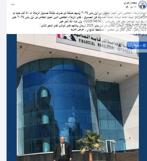 جاء ذلك بعد تداول منشور لـ م. ز يحث المعلمين الذين أحيلوا للمعاش التواصل معه عبر رقمه بتطبيق واتس أب وارسال بياناتهم كاملة لحل أي مشكلات قد تواجههم في صرف مكافأة صندوق الومالة 50 ألف جنيها بدعوى تواصله مع الهيئة العامة للرقابة المالية المسئولة عن الصندوق.