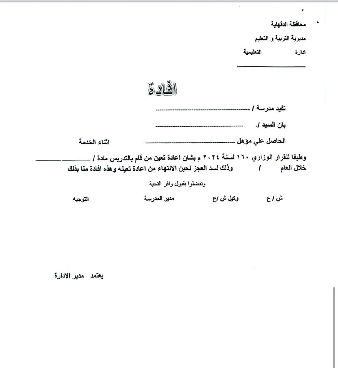 جاء ذلك بناءا على الفاكس الوارد من الوزارة بشأن إعادة تعيين العاملين بالمدارس والإدارات التعليمية والمديرية التعليمية من الحاصلين على مؤهل عالٍ أثناء الخدمة وتنفيذًا للقرار الوزاري رقم ١٦٠ لسنة ٢٠٢٤.