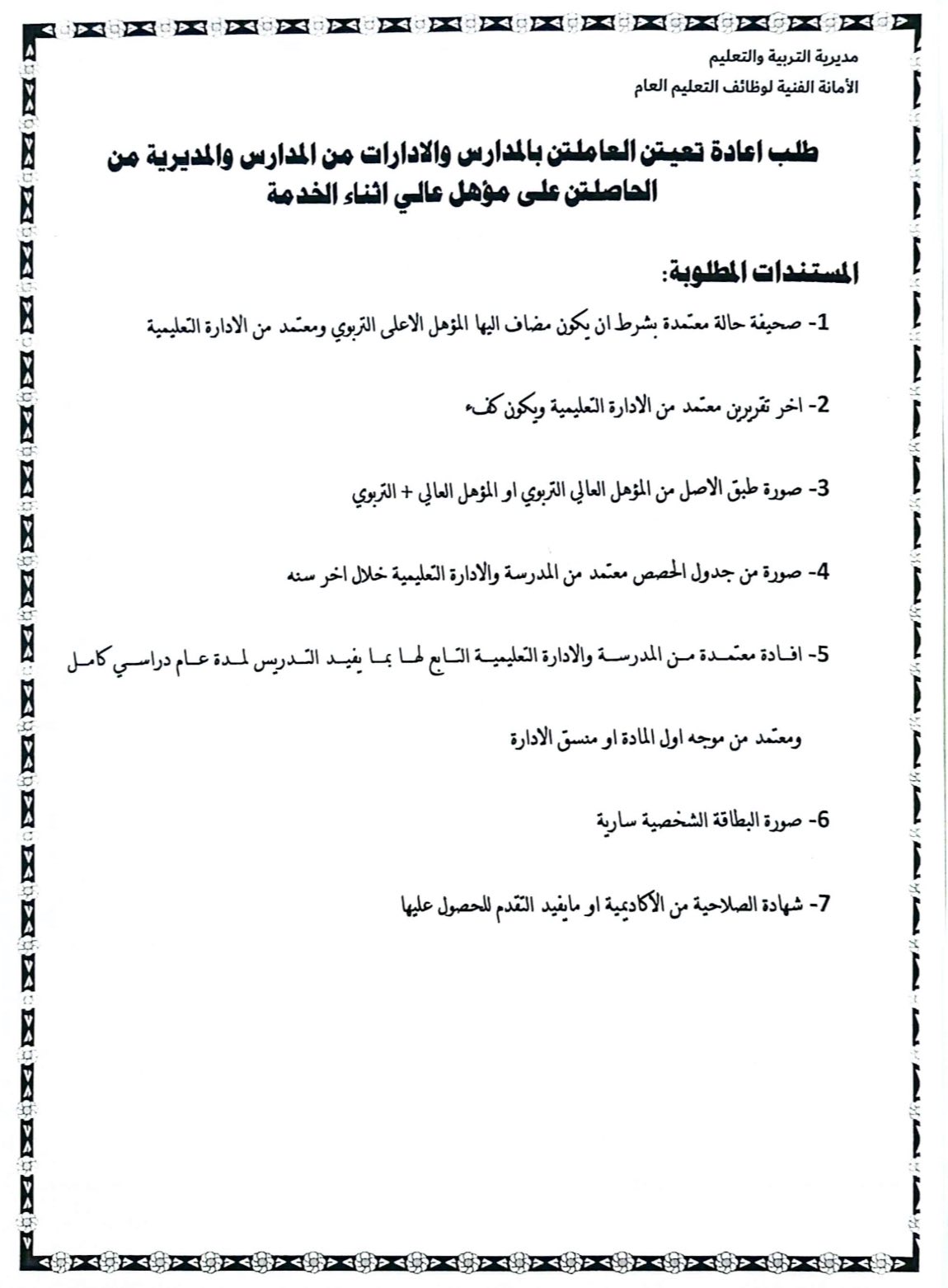 - صحيفة حالة معتمدة بشرط أن يكون مضاف إليها المؤهل الأعلى التربوي ومعتمد من الإدارة التعليمية