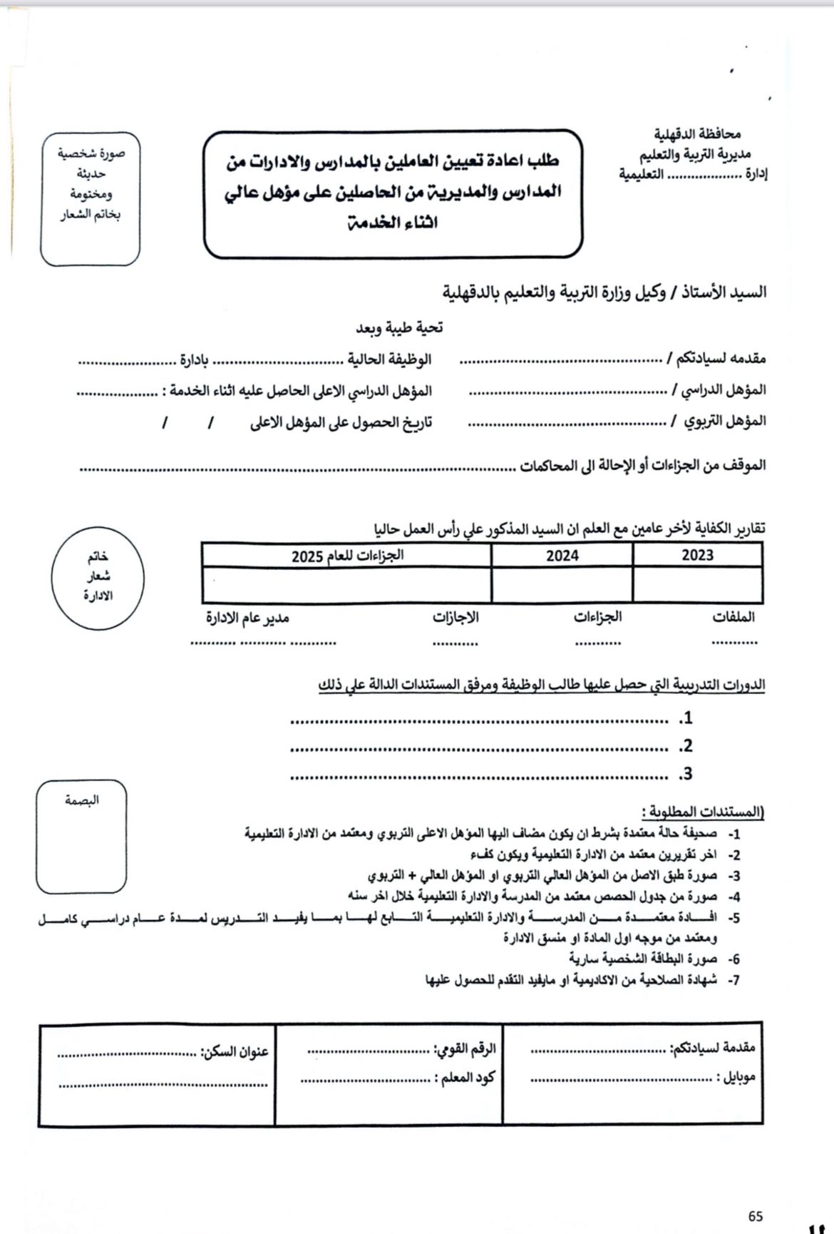 - طلب إعادة تعيين العاملين بالمدارس والإدارات من المدارس والمديرية من الحاصلين على مؤهل عالي اثناء الخدمة
