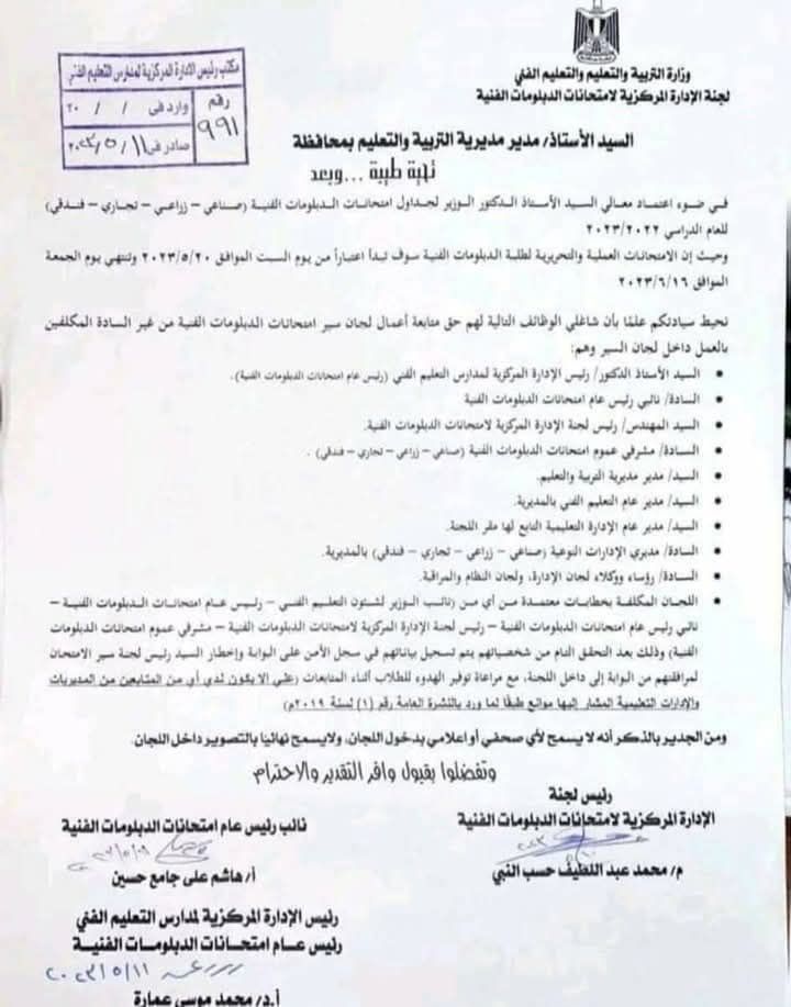 - اللجان المكلفة بخطابات معتمدة من أي من نائب الوزير الشئون التعليم الفني - رئيس عام امتحانات الدبلومات الفنية -