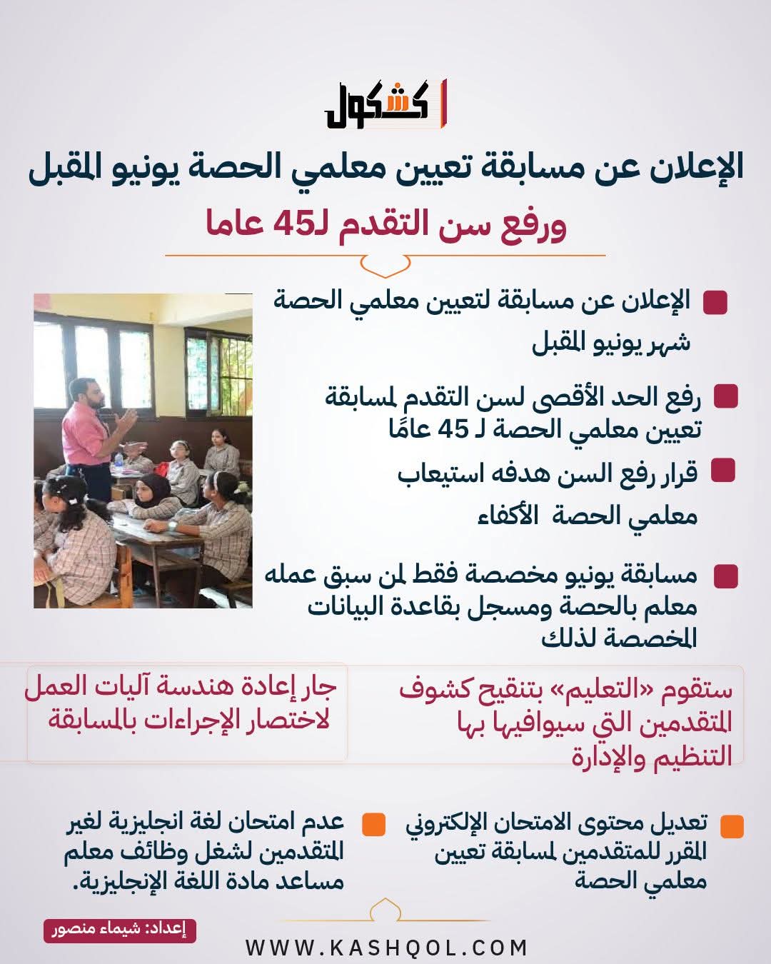 مسابقة تعيين معلمي الحصة يونيو المقبل ورفع سن التقدم لـ45 عاما «انفوجراف»