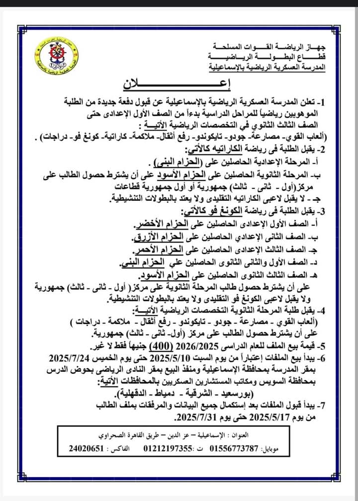 يستهدف إعلان المدرسة العسكرية الرياضية بالإسماعيلية الطلبة من الذكور فقط، من الصف الأول الإعدادي حتى الصف الثالث الثانوي، في عدد من التخصصات الرياضية.