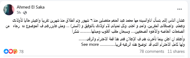 وكتبت الصفحة المنسوبة الى السقا قائلةً: "الناس اللي بتسأل... أنا والسيدة مها محمد عبد المنعم منفصلين من ستة أشهر، وتم الطلاق رسميًا منذ شهرين تقريبًا، وأعيش حاليًا لأولادي وعملي وأصدقائي المقرّبين وأمي وأختي، وكل تمنياتي لأم أولادي بالتوفيق والستر".