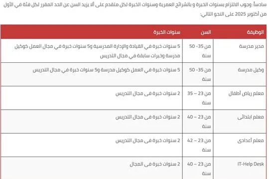 وحددت وزارة التربية والتعليم والتعليم الفنى التخصصات والوظائف المطلوبة للتقدم للعمل بالمدارس المصرية اليابانية للعام الدراسى المقبل 2026، حيث تحتاج إلى وظيفة مدير مدرسة ووكيل مدرسة ومعلم ابتدائي وإعدادى ومعلم رياض أطفال.