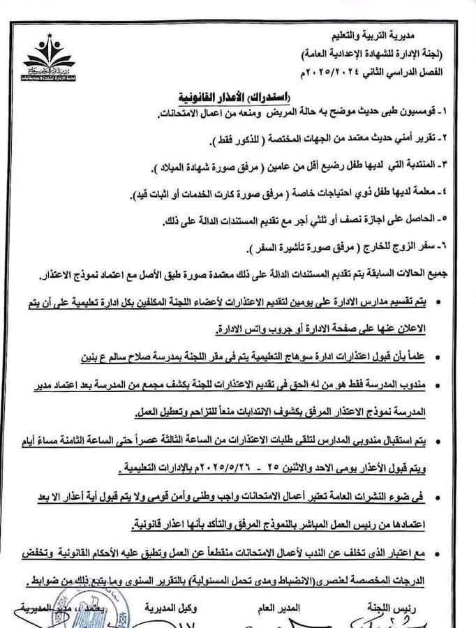 ضوابط الاعتذار عن امتحانات الشهادة الإعدادية الترم الثاني 2025