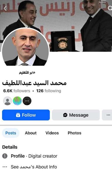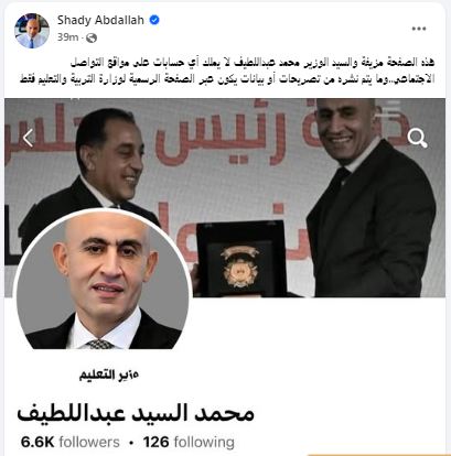 وفي منشور، أوضح المتحدث باسم وزارة التربية والتعليم والتعليم الفني أن هذه الصفحة مزيفة والوزير محمد عبداللطيف لا يملك أي حسابات على مواقع التواصل الاجتماعي.