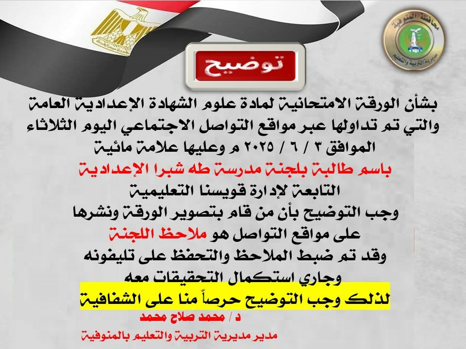 أوضحت مديرية التربية والتعليم والتعليم الفني بمحافظة المنوفية، أن الورقة الامتحانية لمادة "العلوم" الخاصة بالشهادة الإعدادية العامة، والتي تم تداولها عبر مواقع التواصل الاجتماعي اليوم الثلاثاء الموافق ٣ / ٦ / ٢٠٢٥، وعليها علامة مائية باسم طالبة بلجنة مدرسة طه شبرا الإعدادية التابعة لإدارة قويسنا التعليمية، قد تبيّن من التحقيقات أن من قام بتصوير الورقة ونشرها هو أحد الملاحظين باللجنة.