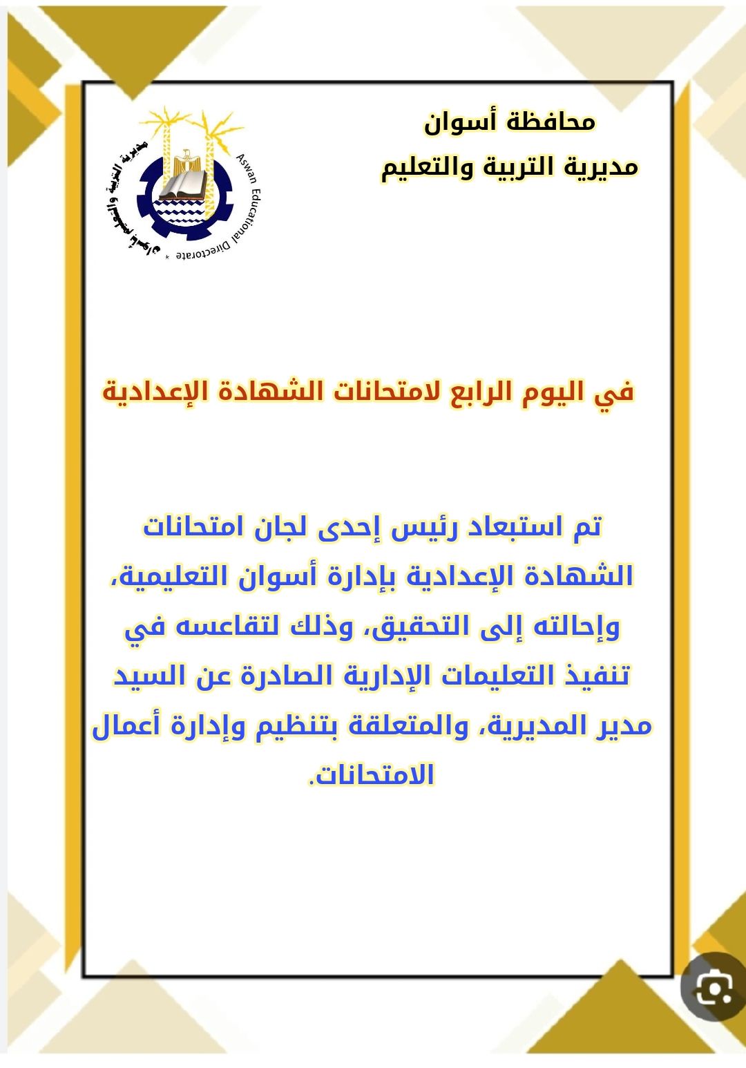 وأشارت مديرية التربية والتعليم بمحافظة أسوان، أنه تم استبعاد رئيس إحدى لجان امتحانات الشهادة الإعدادية بإدارة أسوان التعليمية، وإحالته إلى التحقيق، وذلك لتقاعسه في تنفيذ التعليمات الإدارية الصادرة عن السيد مدير المديرية، والمتعلقة بتنظيم وإدارة أعمال الامتحانات.