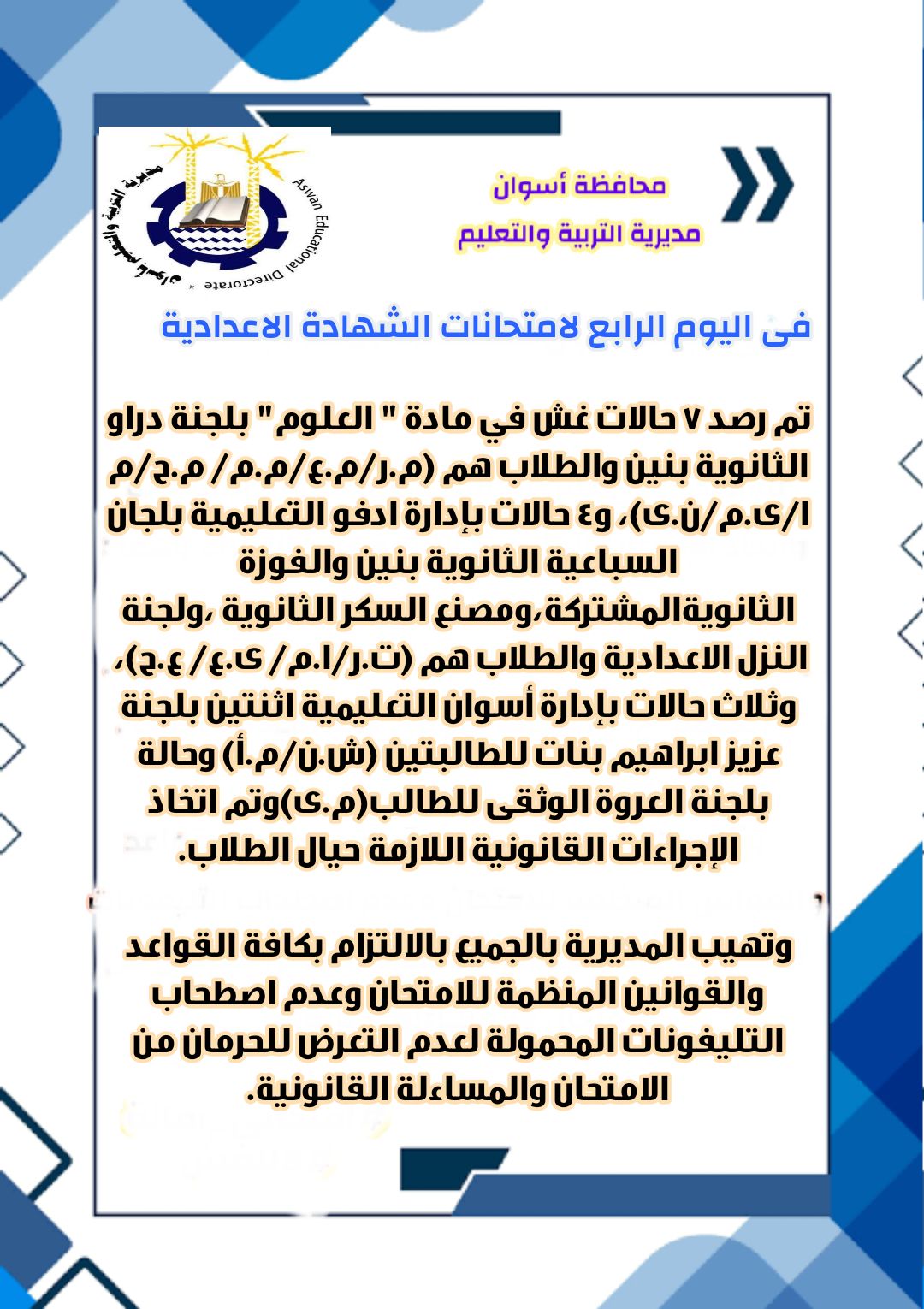 أوضحت مديرية التربية والتعليم والتعليم الفني بمحافظة أسوان، أنه تم رصد ٧ حالات غش في مادة " العلوم " بلجنة دراو الثانوية بنين والطلاب هم م.ر/م٤٠ / م.م / م.د /م اى.م / ن.ى)، و٤ حالات بإدارة ادفو التعليمية بلجان السباعية الثانوية بنين والفوزة الثانوية المشتركة، ومصنع السكر الثانوية، ولجنة النزل الإعدادية والطلاب هم تر/ا.م / ى.ع / ٦٠٤) وثلاث حالات بإدارة أسوان التعليمية اثنتين بلجنة عزيز ابراهيم بنات للطالبتين (ش.ن / م.أ) وحالة بلجنة العروة الوثقى للطالب (م.ى) وتم اتخاذ الإجراءات القانونية اللازمة حيال الطلاب.