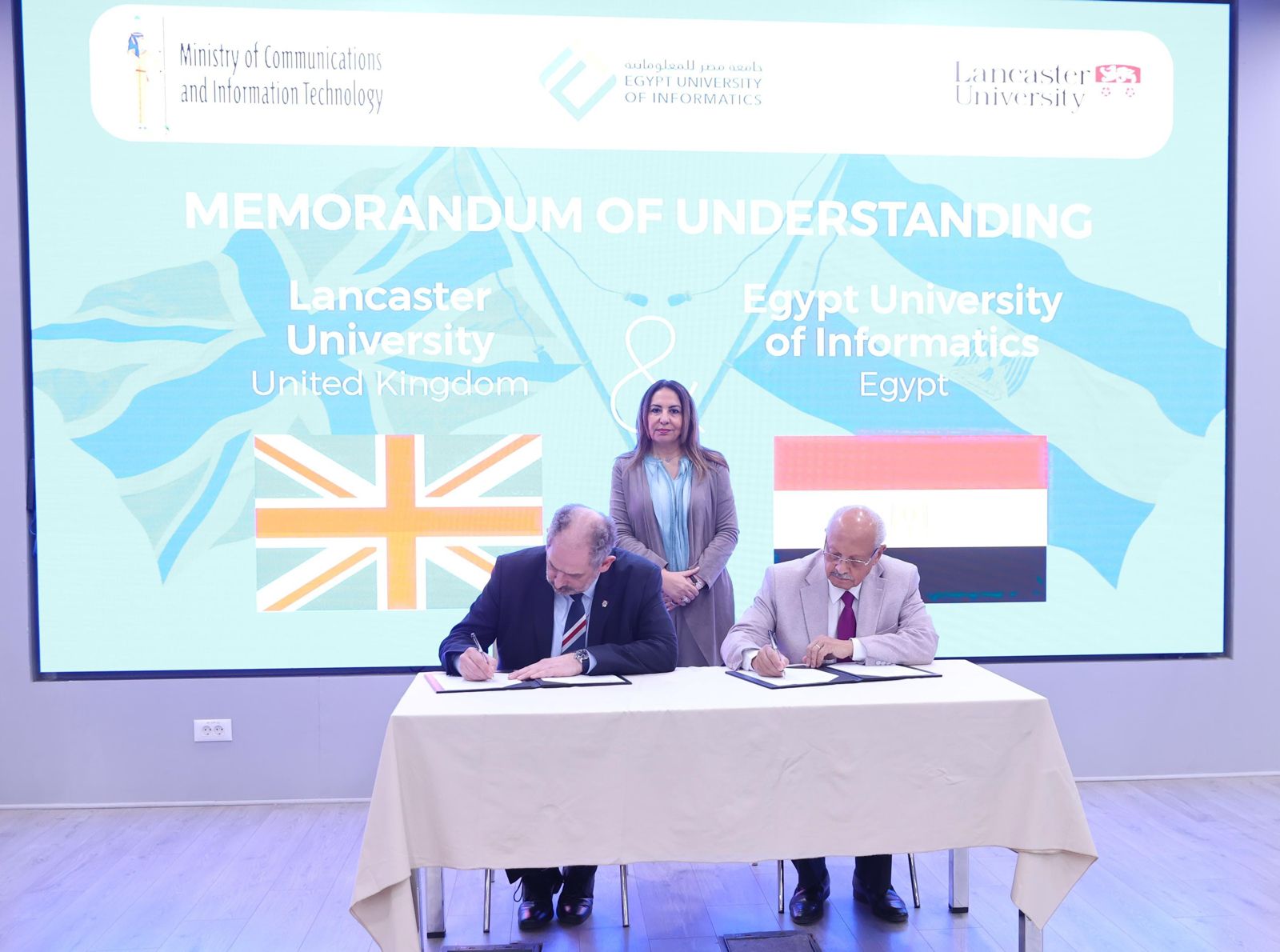 وقع الاتفاق الدكتور أحمد حمد القائم بأعمال رئيس جامعة مصر للمعلوماتية، والبروفيسور كريك سمبيل مدير البحوث الدولية بجامعة "لانكستر"، كما شهد التوقيع كلا من السفير شريف كامل سفير مصر بلندن، وذلك عبر الاتصال بشبكة الانترنت، ومارك هوارد مدير المركز الثقافي البريطاني بمصر والبروفيسور مروان عز الدين أستاذ اقتصاديات التمويل بجامعة "لانكستر"، بجانب عمداء كليات مصر للمعلوماتية وقيادات الجامعة.