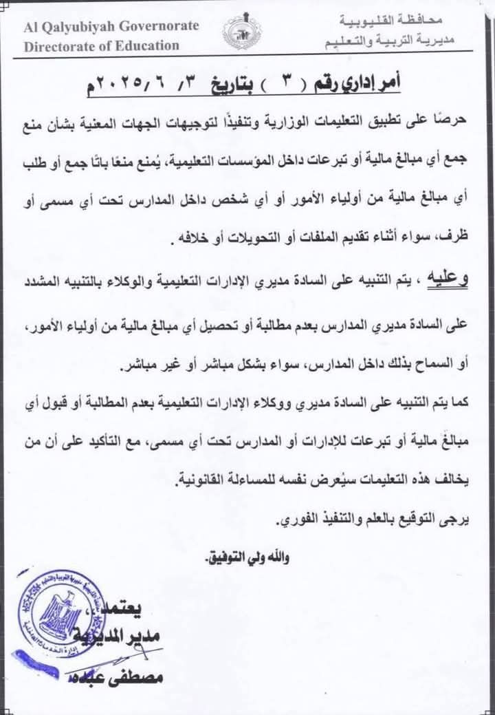 أصدرت مديرية التربية والتعليم والتعليم الفني بمحافظة القليوبية، أمر إداري رقم ( 3 ) بتاريخ ٢٠٢٥/٦/٣م، بشأن منع جمع أي مبالغ مالية أو تبرعات داخل المؤسسات التعليمية.