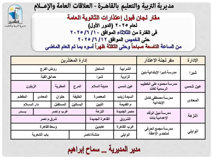 أعلنت مديرية التربية والتعليم والتعليم الفني بالقاهرة، أماكن مقار لجان قبول اعتذارات الثانوية العامة لعام 2025 (الدور الأول).