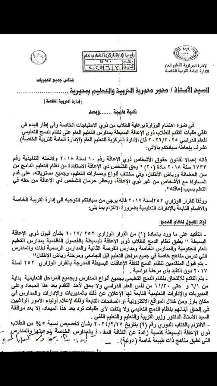 - التأكيد على ما ورد بالمادة (1) من القرار الوزاري ۲۵۲ / ۲۰۱۷ بشأن قبول ذوي الإعاقة البسيطة "