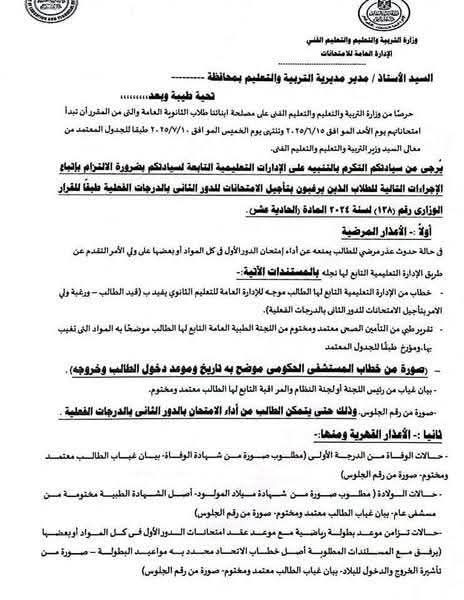 حيث وجهت الوزارة بضرورة التنبيه على الإدارات التعليمية بالالتزام بإتباع الإجراءات التالية للطلاب الذين يرغبون بتأجيل الامتحانات للدور الثاني بالدرجات الفعلية طبقا للقرار الوزاري رقم (۱۳۸) لسنة ٢٠٢٤ المادة الحادية عشر.