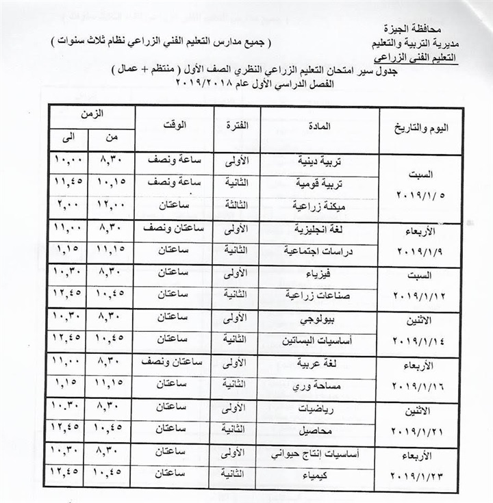 أعلنت مديرية التربية والتعليم بمحافظة الجيزة، جدوال امتحانات النقل للتعليم الزراعي نظام الثلاث سنوات "منتظم -عمال -مهنى" للفصل الدراسى الأول 2019/2018 "