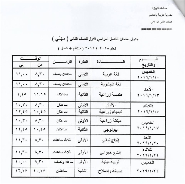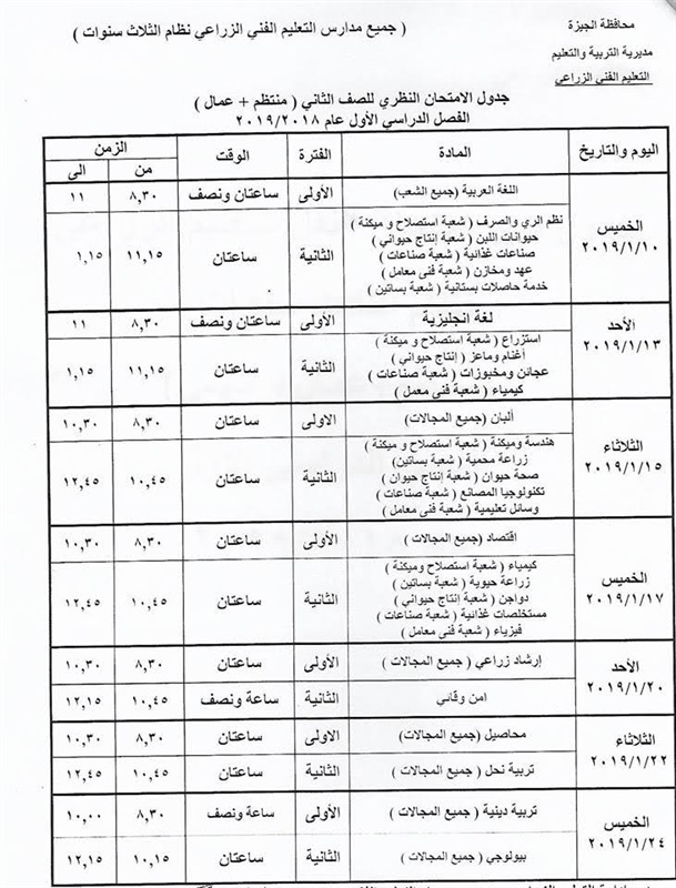 جداول امتحانات النقل للتعليم الزراعي نظام الثلاث سنوات بالجيزة