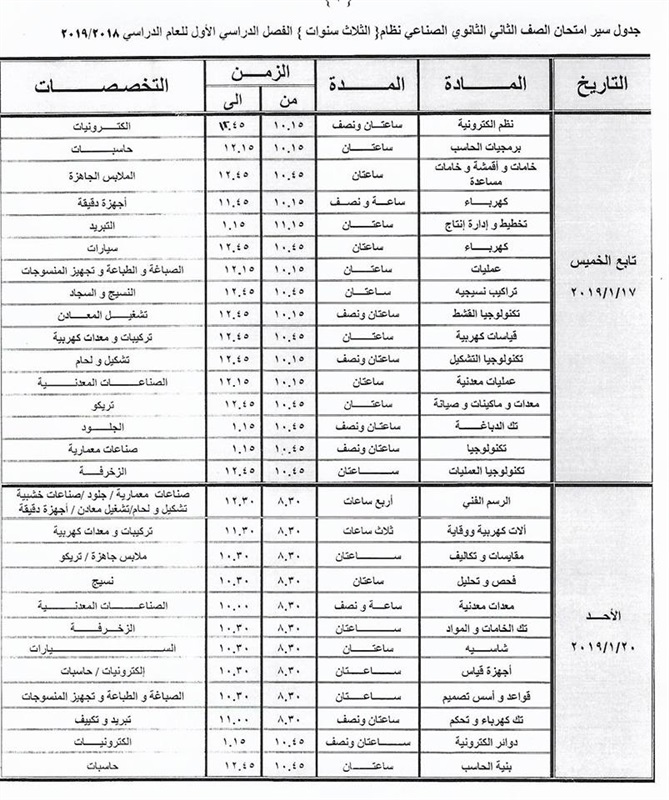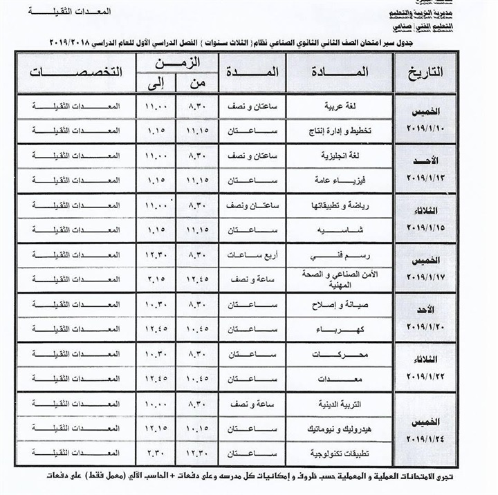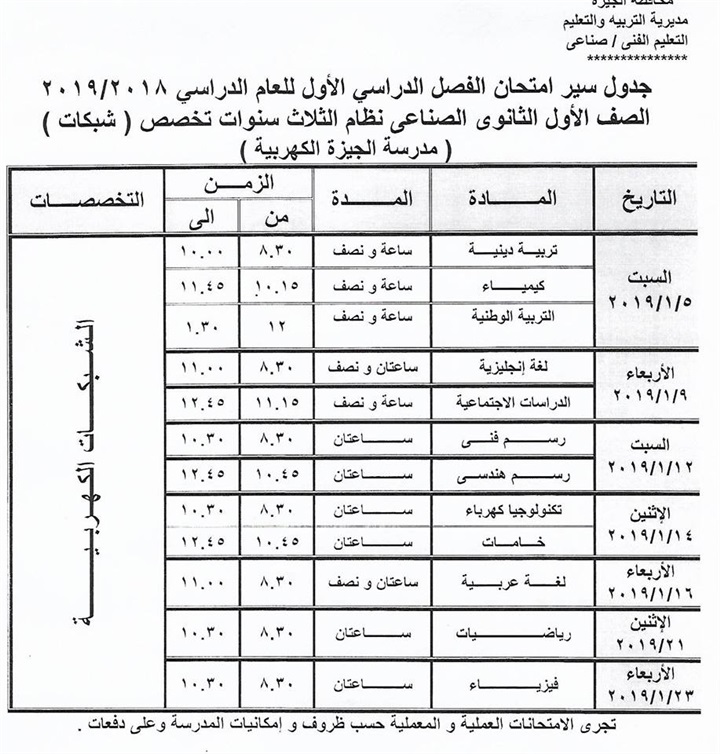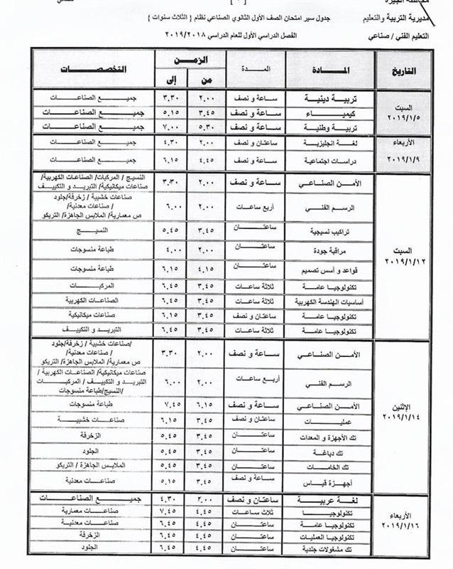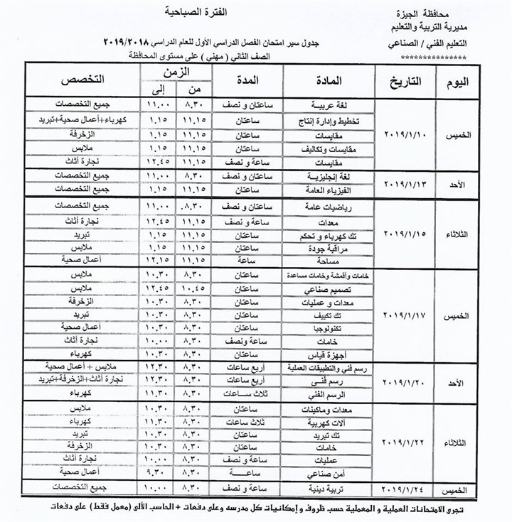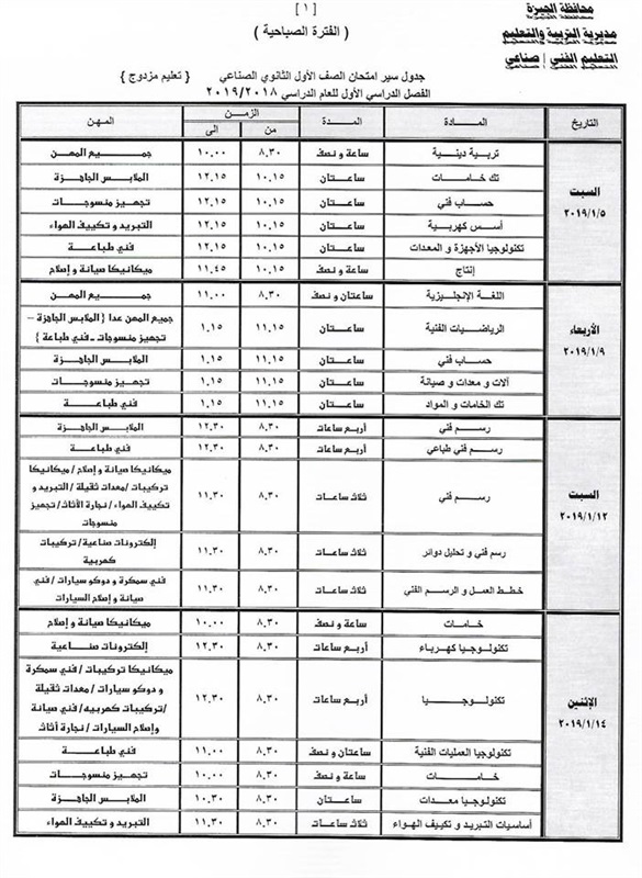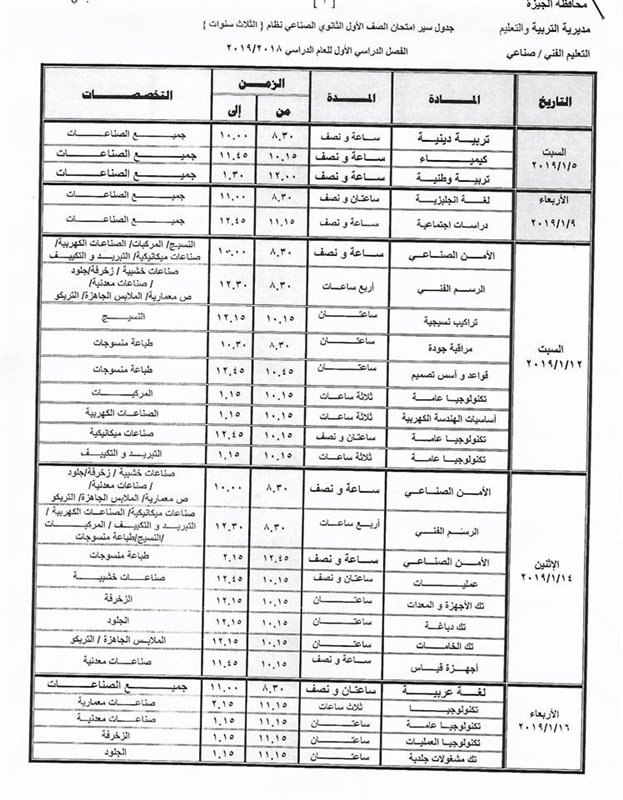 أعلنت مديرية التربية والتعليم بالجيزة، جدوال امتحانات النقل للتعليم الصناعى لمحافظة الجيزة للفصل الدراسى الأول 2019/2018، لكلا من: