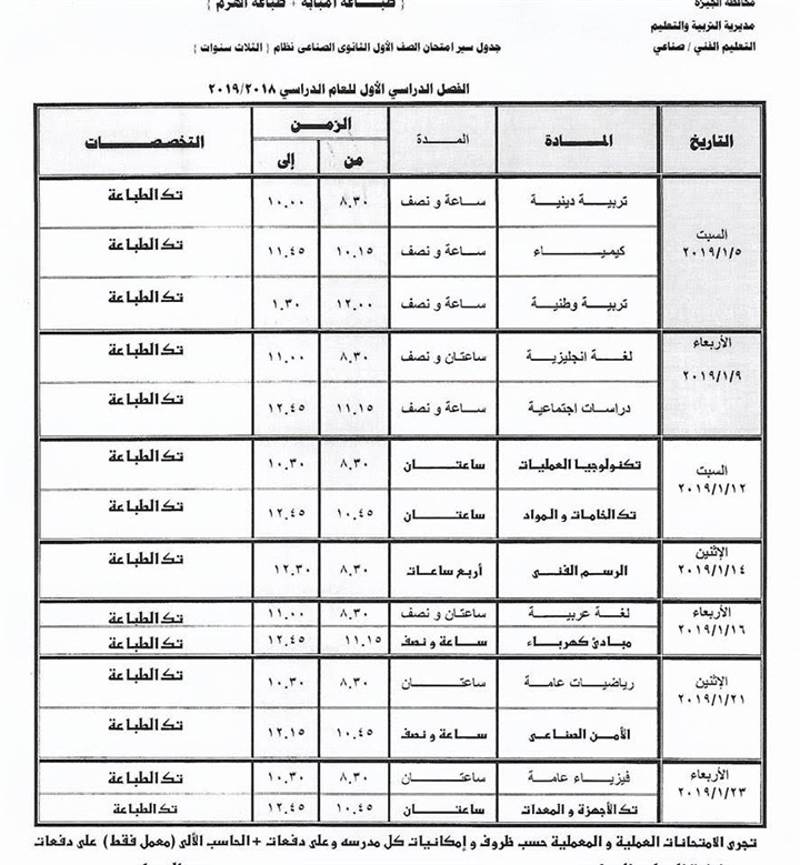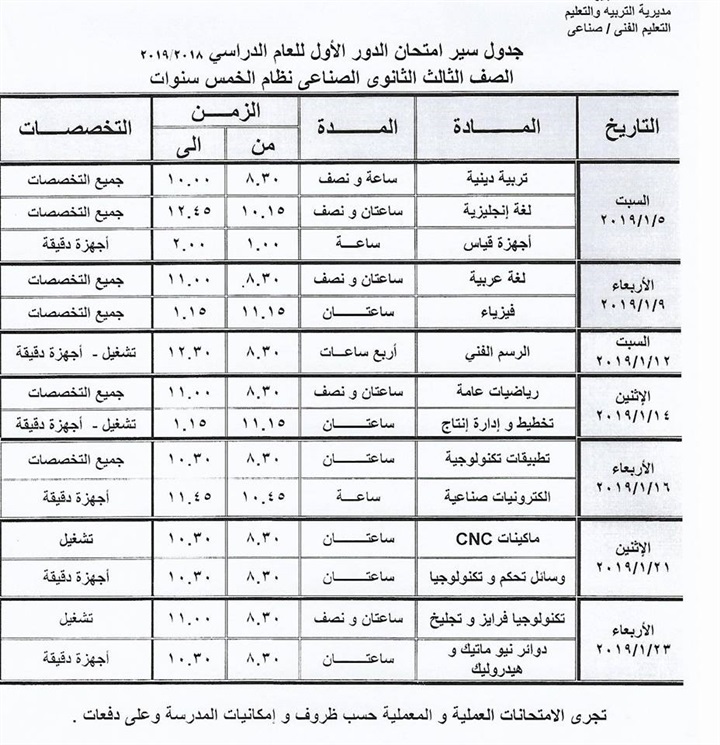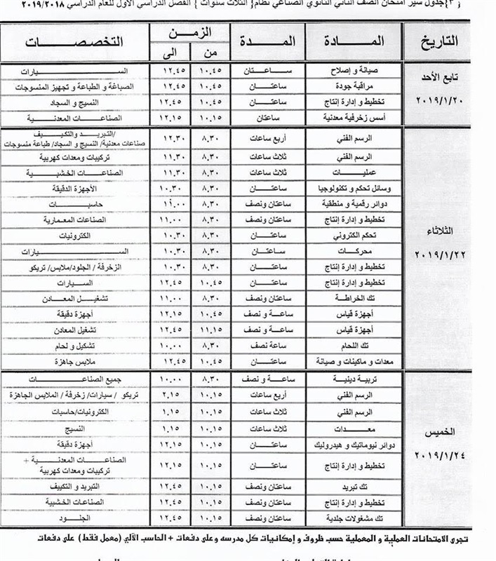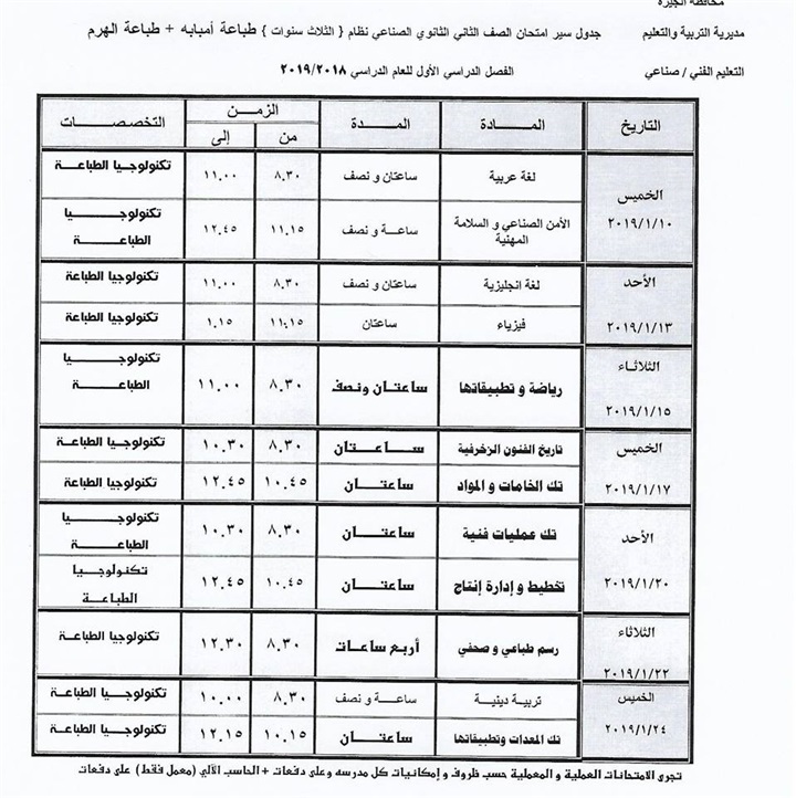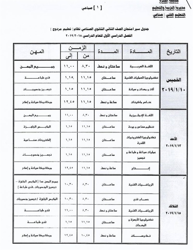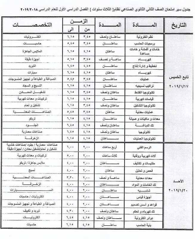 أعلنت مديرية التربية والتعليم بالجيزة، جدوال امتحانات النقل للتعليم الصناعى لمحافظة الجيزة للفصل الدراسى الأول 2019/2018، لكلا من:
