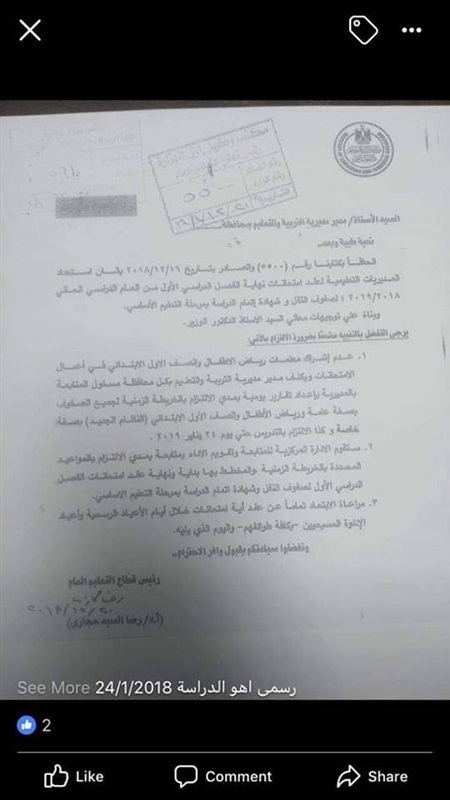 1- يمنع إشراك معلمات رياض الأطفال والصف الأول الابتدائى فى أعمال امتحانات الفصل الدراسي الأول على أن يكلف مدير المديرية فى كل محافظة مسئول المتابعة بإعداد تقارير يومية بمدى الالتزام بالخريطة الزمنية للعام الدراسى لطلاب النظام الجديد والالتزام بالتدريس حتى يوم 24 يناير المقبل.