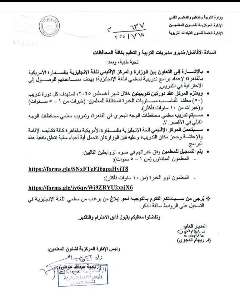 ونص الخطاب، على أنه بالإشارة إلى التعاون بين الوزارة والمركز الإقليمي للغة الإنجليزية بالسفارة الأمريكية بالقاهرة؛ لإعداد برامج تدريبية لمعلمي اللغة الإنجليزية؛ بهدف مساعدتهم للوصول إلى الاحترافية في التدريس، يعتزم المركز عقد دورتين تدريبيتين خلال شهر أغسطس ۲۰۲٥.