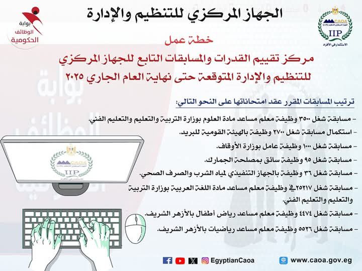 أعلن المهندس حاتم نبيل، رئيس الجهاز المركزي للتنظيم والإدارة، عن الترتيب المبدئي لعقد امتحانات عدد من مسابقات التوظيف بالجهاز الإداري للدولة حتى نهاية العام الجاري 2025، وذلك في إطار توجه الجهاز نحو تعزيز الشفافية، وتوفير رؤية تنظيمية واضحة تمكن المتقدمين من الاستعداد المبكر للامتحانات.