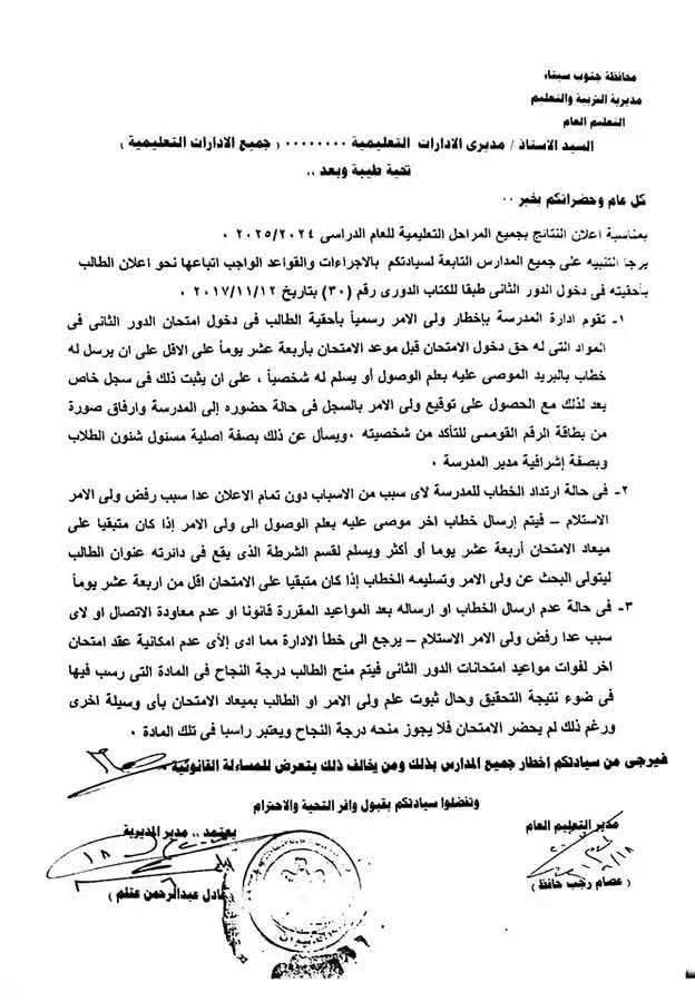 وأشارت إلى أنه تقوم إدارة المدرسة بإخطار ولى الأمر رسميًا بأحقية الطالب في دخول امتحان الدور الثاني في المواد التى له حق دخول الامتحان قبل موعد الامتحان بأربعة عشر يومًا على الأقل على أن يرسل له خطاب بالبريد الموصى عليه بعلم الوصول أو يسلم له شخصيًا، على أن يثبت ذلك في سجل خاص بعد لذلك مع الحصول على توقيع ولى الأمر بالسجل فى حالة حضوره إلى المدرسة وارفاق صورة من بطاقة الرقم القومي للتأكد من شخصيته، ويسأل عن ذلك بصفة أصلية مسئول شئون الطلاب وبصفة إشرافية مدير المدرسة.