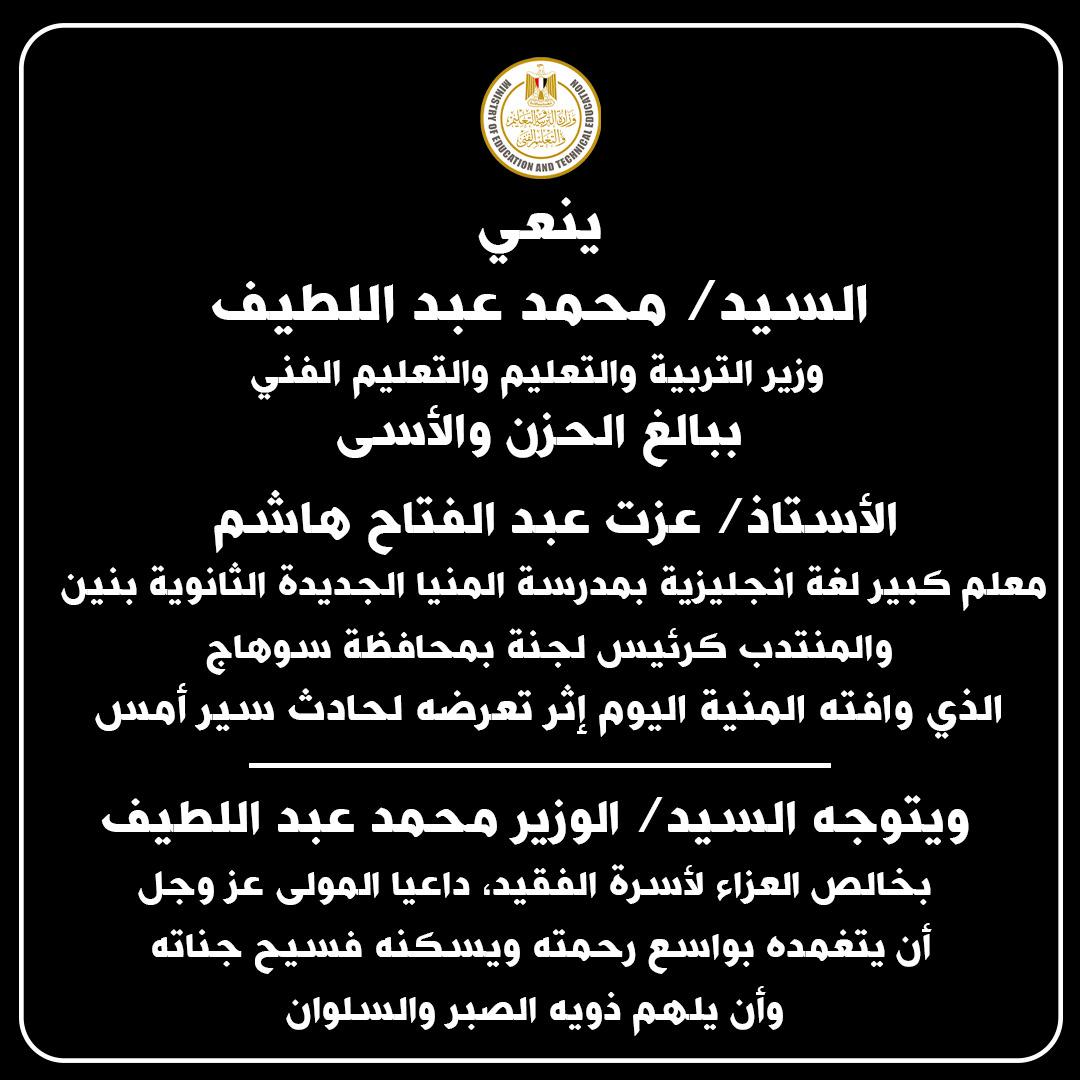 نعى محمد عبد اللطيف وزير التربية والتعليم والتعليم الفني ببالغ الحزن والأسى الأستاذ عزت عبد الفتاح هاشم - معلم كبير لغة انجليزية بمدرسة المنيا الجديدة الثانوية بنين والمنتدب كرئيس لجنة بمحافظة سوهاج - الذي وافته المنية اليوم إثر تعرضه لحادث سير أمس.