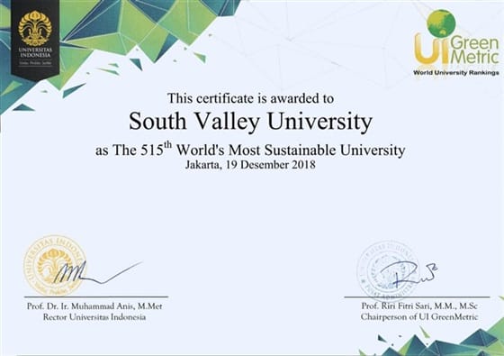 أعلن الدكتور عباس منصور رئيس جامعة جنوب الوادي، حصول الجامعة على مركز 515 بين الجامعات العالمية، وفقاً لتصنيف جرين ماترك (Green Metric)، والثالث على مستوى الجامعات المصرية.