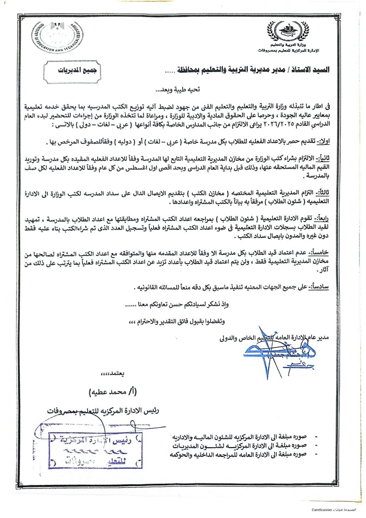 - عدم اعتماد قيد الطلاب بكل مدرسة إلا وفقًا للأعداد المقدمة منها والمتوافقة مع أعداد الكتب المشتراه لصالحها من مخازن المديرية التعليمية فقط، ولن يتم اعتماد قيد الطلاب بأعداد تزيد عن أعداد الكتب المشتراه فعليًا بما يترتب على ذلك من آثار.