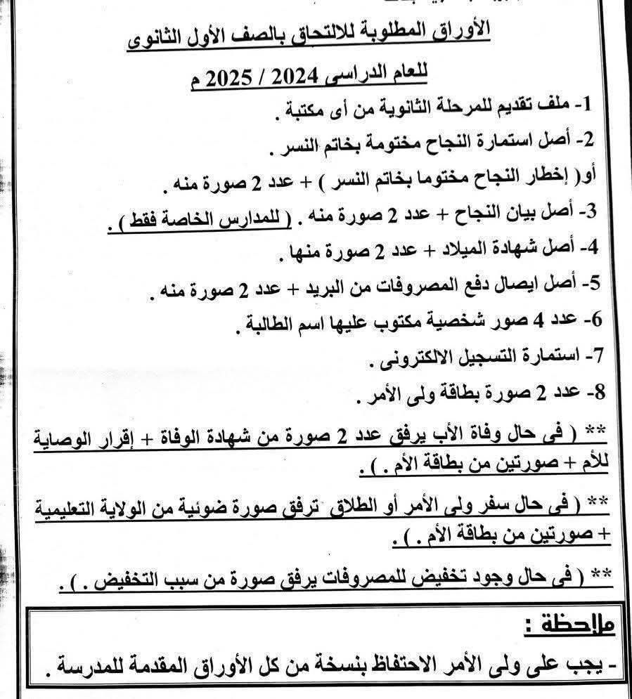 الأوراق المطلوبة للالتحاق بالصف الأول الثانوى للعام الدراسي 2025/2026