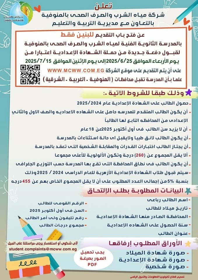 أعلن المهندس رشدى السيد عمر رئيس شركة مياه الشرب والصرف الصحي بالمنوفية عن فتح باب التقديم للإلتحاق بالمدرسة الثانوية الفنية لمياه الشرب والصرف الصحي بالمنوفية للعام الحالي 2025-2026 م للطلاب من محافظات (المنوفية-الغربية-الشرقية) ابتداءً من يوم الأربعاء الموافق 25 يونيو وحتي الاثنين 15 يوليو 2025 م علي الموقع الإليكتروني للشركة من خلال الرابط