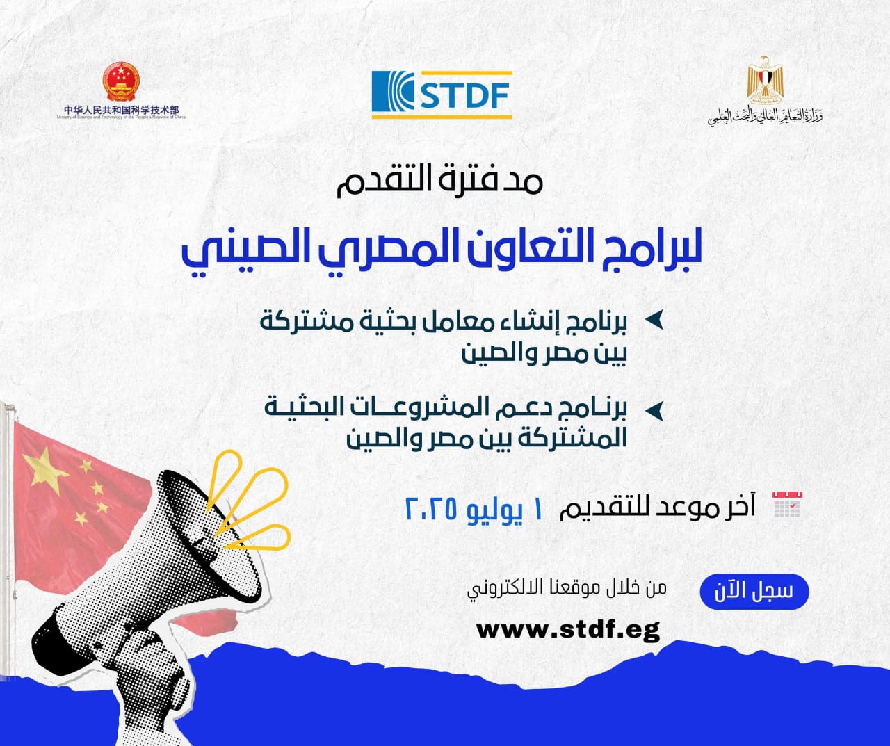 أعلنت هيئة تمويل العلوم والتكنولوجيا والابتكار (STDF)، التابعة لوزارة التعليم العالي والبحث العلمي، عن مد فترة التقدم لبرامج التعاون المصري الصيني، والتي تشمل برنامج إنشاء معامل بحثية مشتركة (النداء الأول)، وبرنامج دعم المشروعات البحثية المشتركة (النداء الثامن)، وذلك في إطار البرنامج التنفيذي الموقع بين حكومتي جمهورية مصر العربية وجمهورية الصين الشعبية.