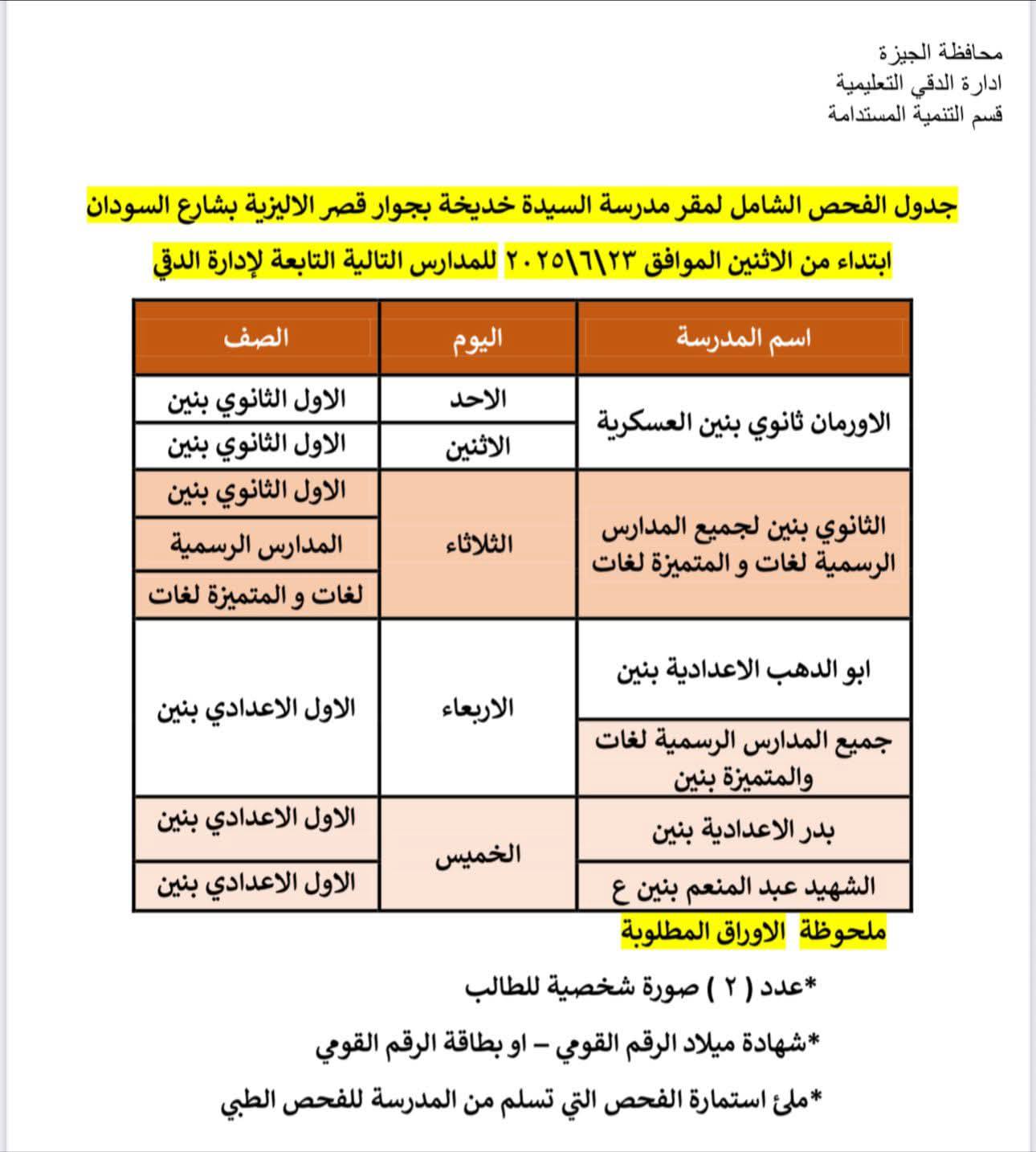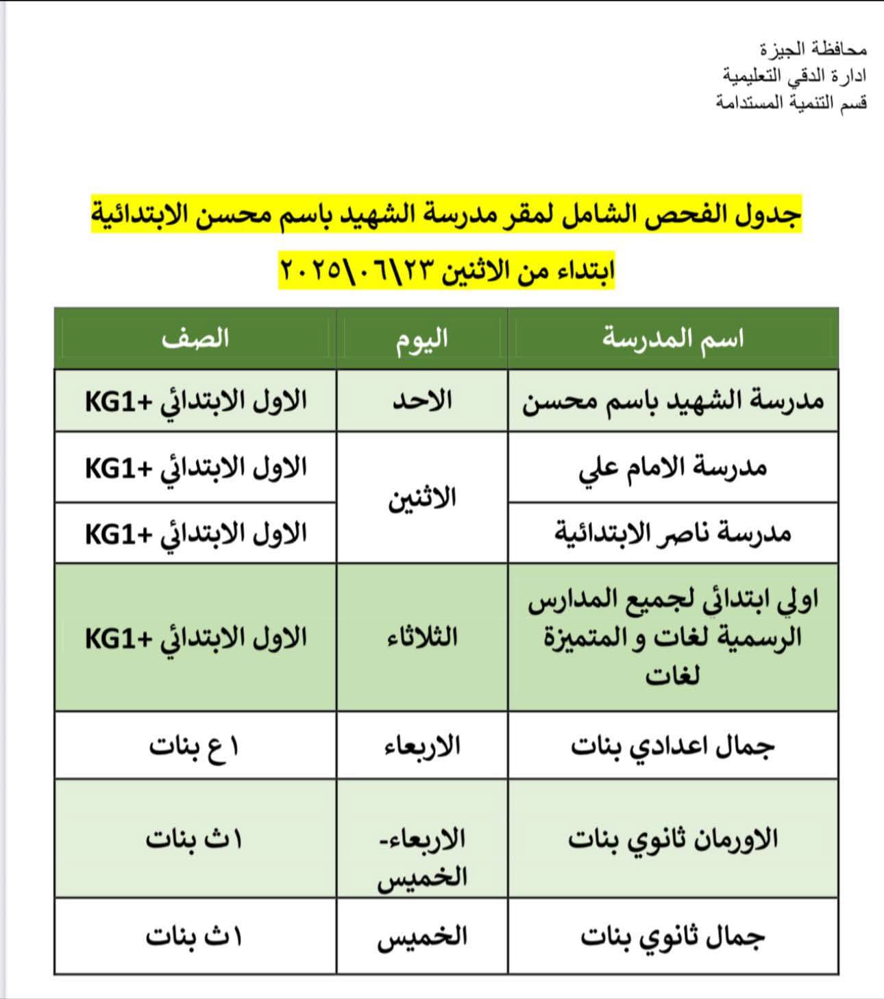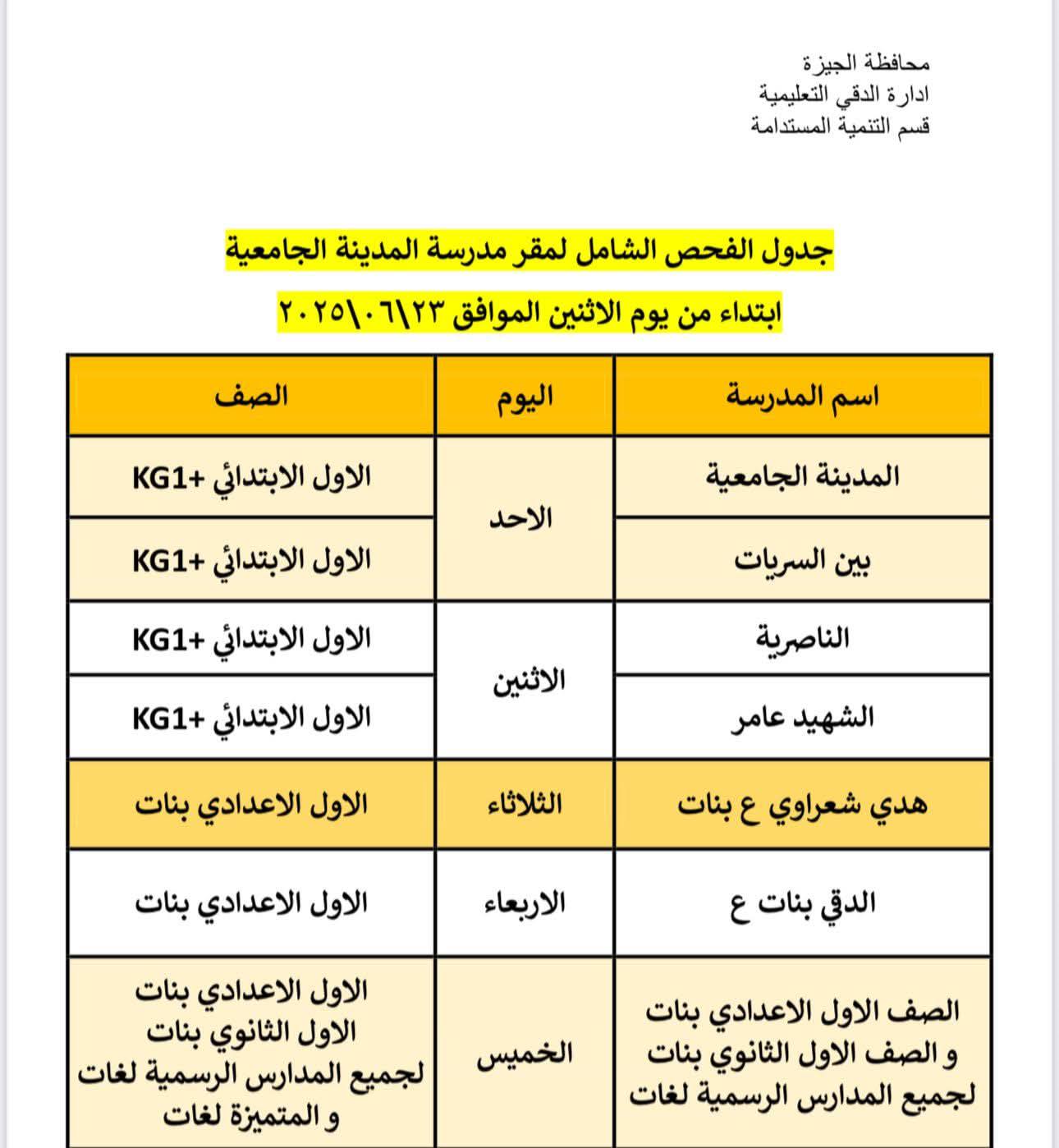 أعلنت مديرية التربية والتعليم والتعليم الفني بمحافظة الجيزة، بدء اجراء الفحص الطبي الشامل لطلاب للمراحل المستهدفة والتي تضم ( الأول لرياض الأطفال، الأول الابتدائي، الأول الإعدادي، الأول الثانوي" أثناء الإجازة الصيفية مع بدء تقديم أوراق الالتحاق بالمدارس ) 2026-2025.