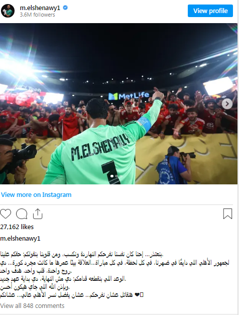 وكتب الشناوى عبر حسابه على إنستجرام: "بنعتذر… إحنا كان نفسنا نفرحكم النهاردة ونكسب، ومن قلوبنا بنقولكم: حقكم علينا.. لجمهور الأهلي اللي دايمًا في ضهرنا، في كل لحظة، في كل مباراة… العلاقة بينّا عمرها ما كانت مجرد كورة… دي روح واحدة، قلب واحد، هدف واحد.. الوعد اللي بنقطعه قدامكم: دي مش النهاية، دي بداية عهد جديد.. وبإذن الله اللي جاي هيكون أحسن.. هنقاتل عشان نفرحكم… عشان يفضل نسر الأهلي عالي… عشانكم".