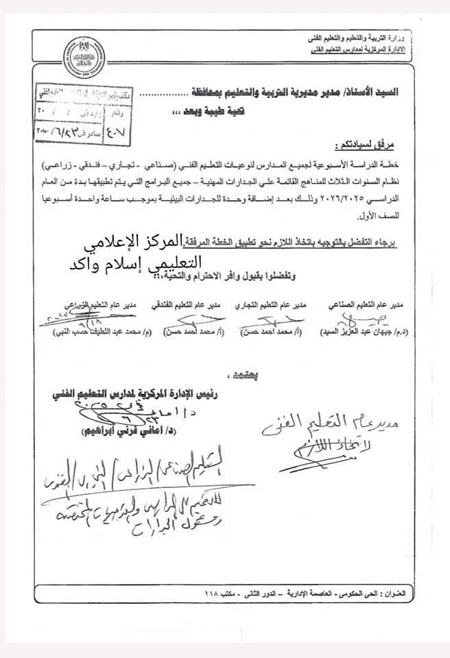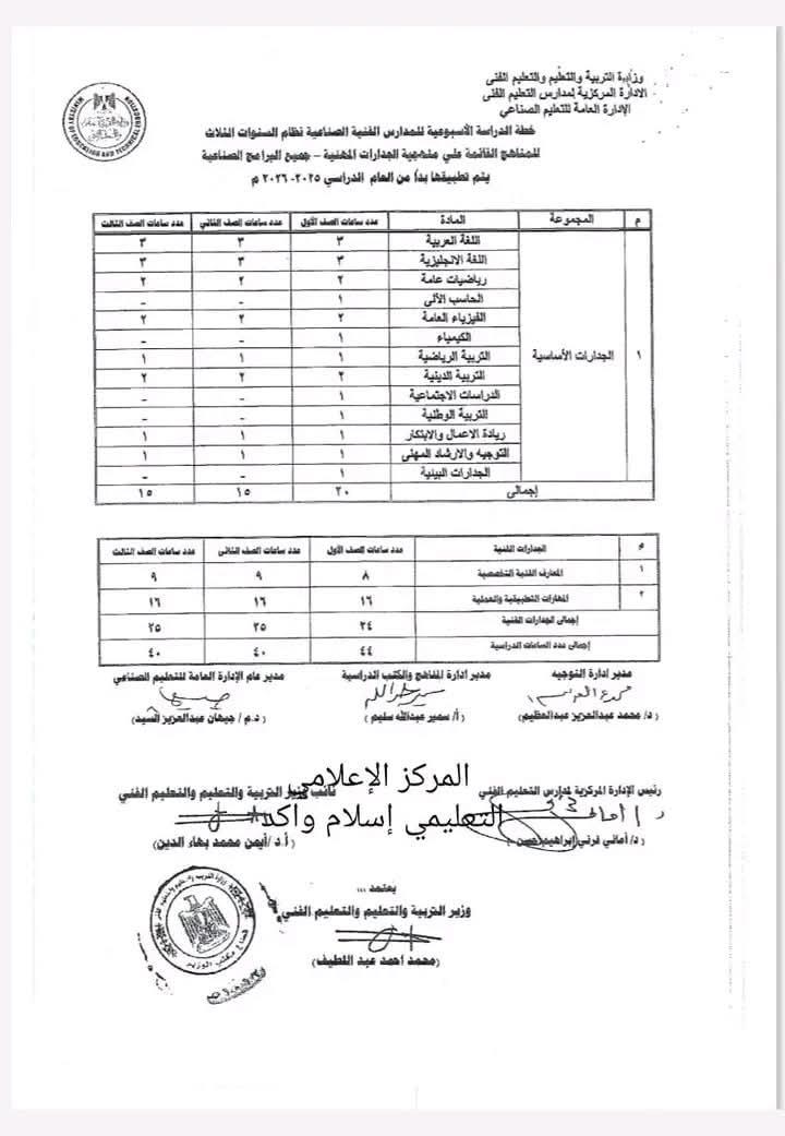 أصدرت وزارة التربية والتعليم والتعليم الفني، خطابًا لجميع المديريات التعليمية بمختلف محافظات الجمهورية بشأن تحديد خطة الدراسة الأسبوعية لجميع المدارس لنوعيات التعليم الفني (صناعي - تجاري - فندقي - زراعي) نظام السنوات الثلاث للمناهج القائمة على الجدارات المهنية، جميع البرامج التي يتم تطبيقها بدة من العام الدراسي 2025 - 2026م، وذلك بعد إضافة وحدة للجدارات البيئية بموجب ساعة واحدة أسبوعيًا للصف الأول.