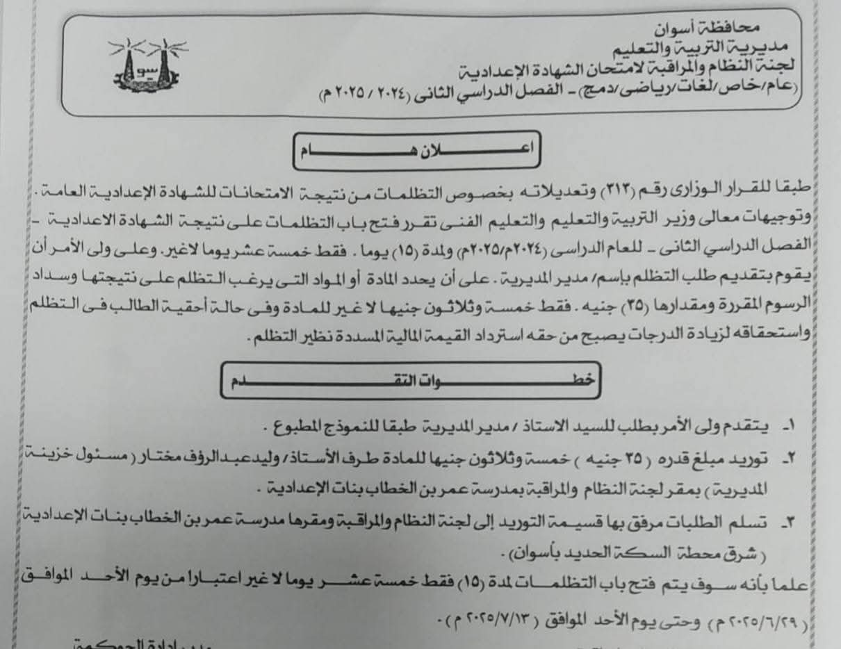 خطوات التقدم بالتظلمات من نتيجة الشهادة الإعدادية 2025 بأسوان