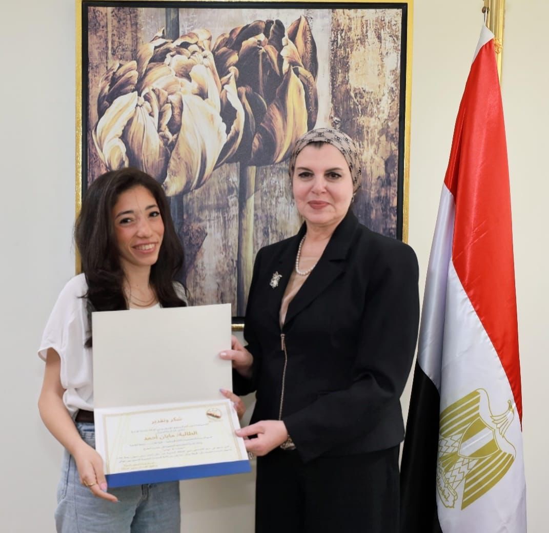 وقد أهدت المستشارة بريهان محسن مديرة وحدة شؤون المرأة وحقوق الإنسان وذوي الإعاقة التابعة لهيئة النيابة الإدارية، الطالبات المكرمات والدكتور محمد أنور المحاضر بقسم الترجمة التخصصية باللغة الإسبانية والمشرف على المشروع، شهادات تقدير، تكريمًا لما قدموه من جهد متميز.