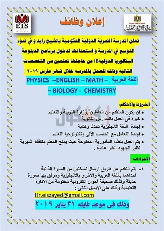 أعلنت المدرسة المصرية الدولية الحكومية بالشيخ زايد، عن حاجتها لمعلمين في التخصصات التالية، للعمل بالمدرسة خلال شهر مارس 2019: اللغة العربية، MATH، English، Physics، Chemistry، Biology".