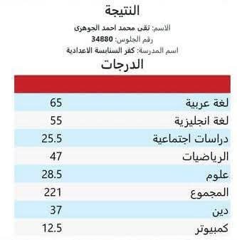 وحصلت الطالبة تقى محمد أحمد الجوهري بمدرسة كفر السنابسة الإعدادية على مجموع 221 درجة من 280 درجة مجموع الشهادة الإعدادية 2025.