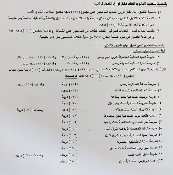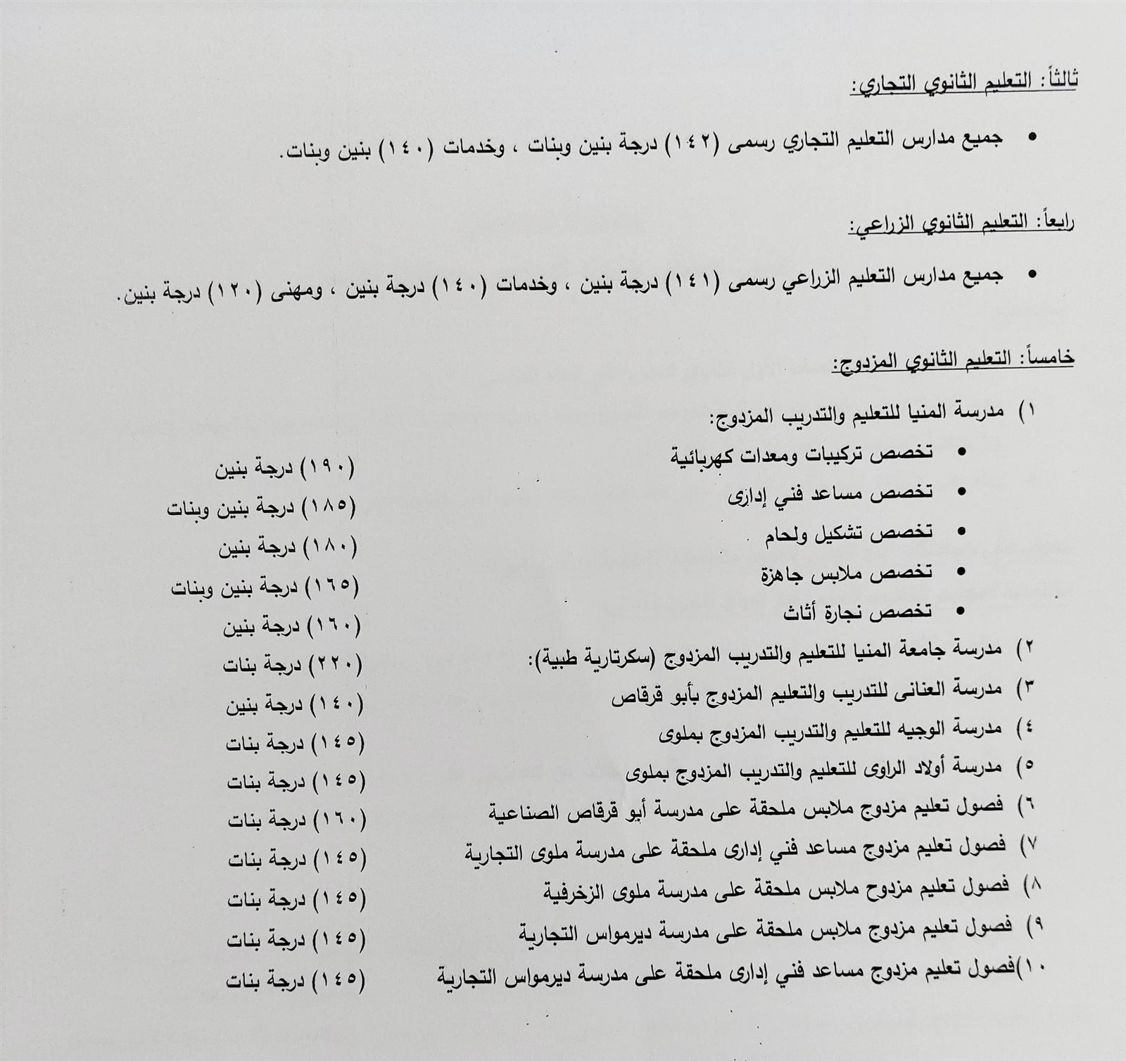 كما اعتمد محافظ المنيا، الحد الأدنى للقبول بالتعليم الفني (صناعي– زراعي– تجاري- فندقي ) ومدارس التعليم والتدريب المزدوج، وكذلك قواعد التنسيق الخاصة بهم.