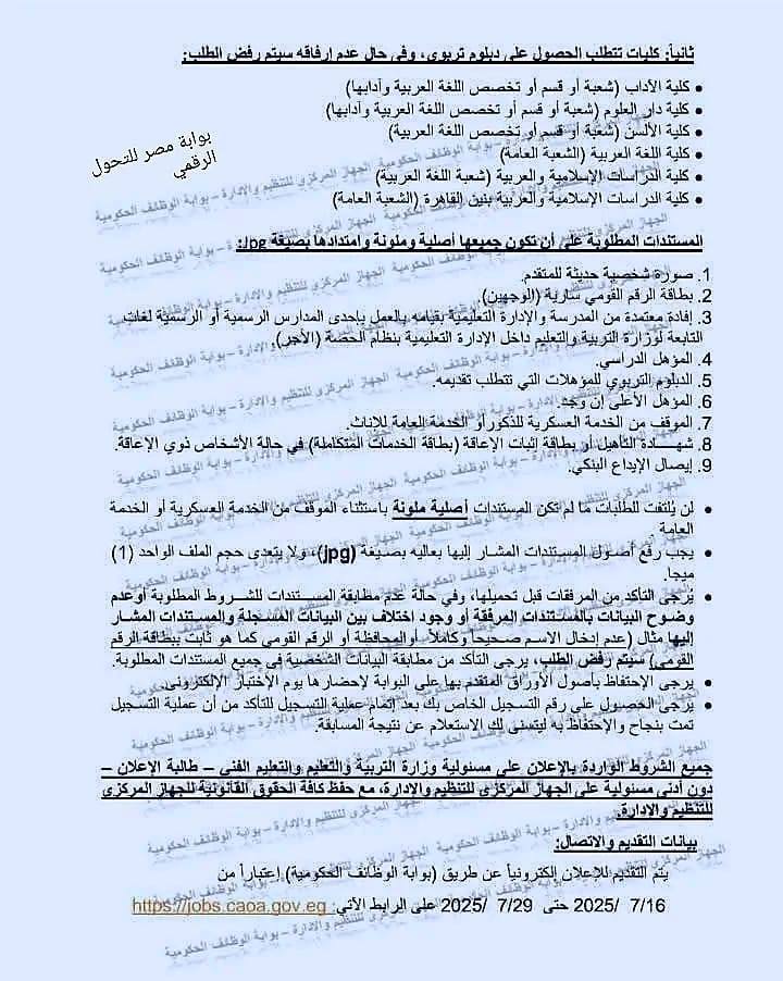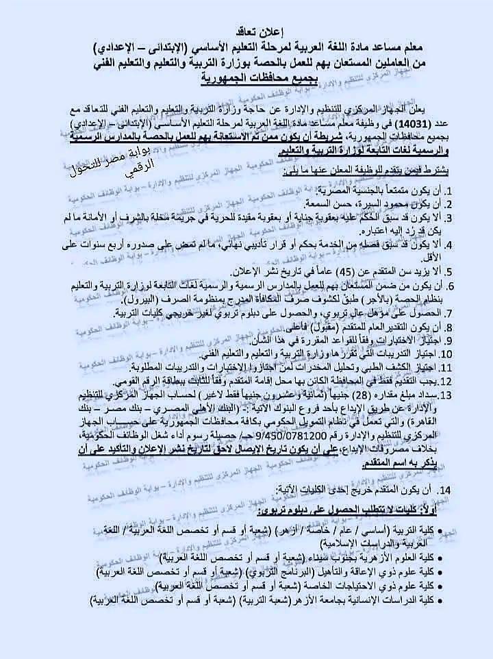 في إطار توجيهات الرئيس عبد الفتاح السيسي رئيس الجمهورية، بتعزيز منظومة التعليم الأساسي وتوفير الكوادر اللازمة لضمان استمرارية العملية التعليمية بجودة عالية، أعلن المهندس حاتم نبيل، رئيس الجهاز المركزي للتنظيم والإدارة، عن مسابقة للتعاقد مع عدد 14031 في وظيفة معلم مساعد لمادة اللغة العربية لمرحلة التعليم الأساسي (الابتدائي – الإعدادي)، وذلك بجميع محافظات الجمهورية، على أن يكون المتقدمون من الذين سبق الاستعانة بهم للعمل بنظام الحصة في المدارس الرسمية والرسمية لغات التابعة لوزارة التربية والتعليم والتعليم الفني.