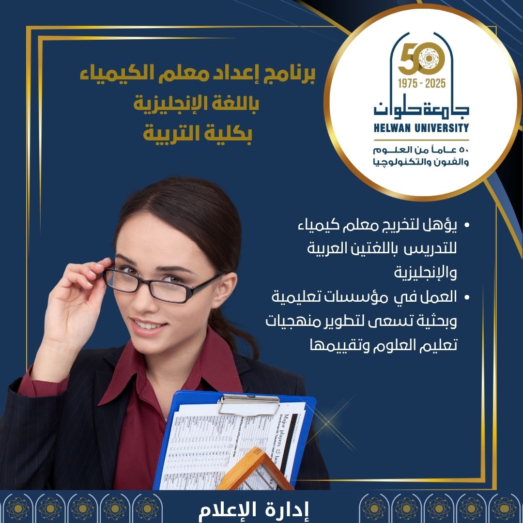 في ظل التوجه نحو تعليم عصري يجمع بين التخصص العلمي والمهارات اللغوية العالمية، تقدم كلية التربية جامعة حلوان برنامج إعداد معلم الكيمياء باللغة الإنجليزية كأحد البرامج المتميزة التي تلبي طموحات الطلاب، وتواكب التطورات المتسارعة في مجالات التعليم والتكنولوجيا، ضمن منظومة برامج خاصة بنظام الساعات المعتمدة تهدف إلى إعداد كوادر تعليمية ذات كفاءة عالية وقادرة على المنافسة في سوق العمل محليًا وإقليميًا.