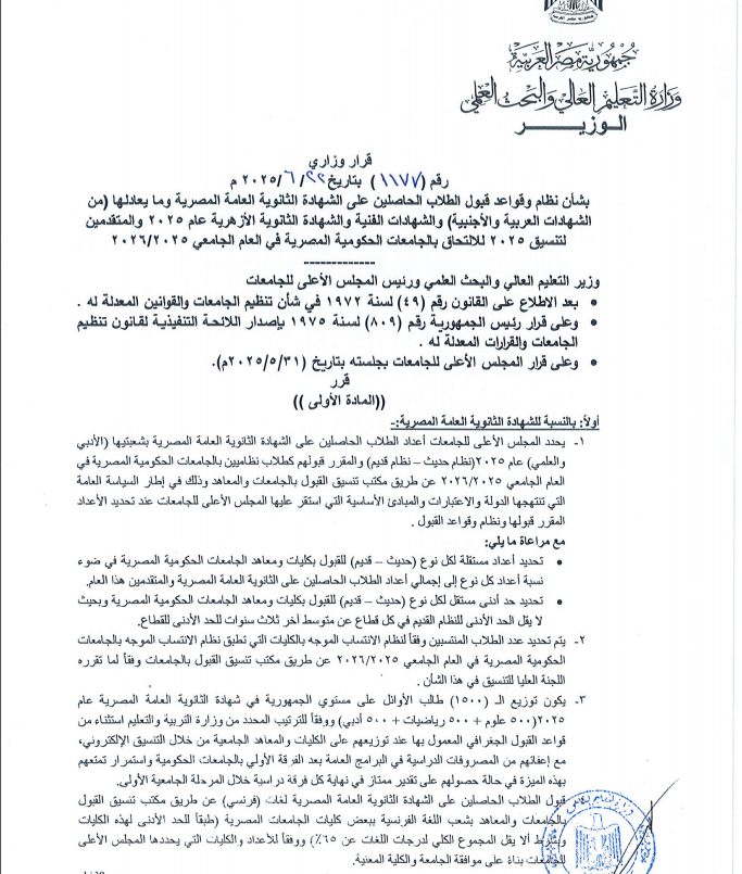 بشأن نظام وقواعد قبول الطلاب الحاصلين على الشهادة الثانوية العامة المصرية وما يعادلها (من الشهادات العربية والأجنبية والشهادات الفنية والشهادة الثانوية الأزهرية عام ٢٠٢٥ والمتقدمين لتنسيق ۲۰۲٥ للالتحاق بالجامعات الحكومية المصرية في العام الجامعي ٢٠٢٦/٢٠٢٥.