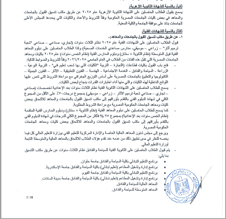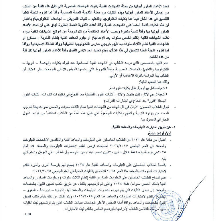 ١- عن طريق مكتب تنسيق القبول بالجامعات والمعاهد قبول الطلاب الحاصلين على الشهادات الفنية عام ۲۰۲٥ نظام الثلاث سنوات تجاري - صناعي - صناعي "شعبة ترميم أثار" - زراعي - موسيقي - مدارس مساعدي الخدمات الصحية وكذا الطلاب الحاصلين على دبلوم المعاهد الفنية فوق المتوسطة نظام الثانوية + (سنتان) ودبلوم المدارس الفنية نظام الخمس سنوات) عام ٢٠٢٥ بكليات ومعاهد الجامعات المصرية التي تقبل هذه الفئات من الطلاب في العام الجامعي ۲۰۲٦/۲۰۲٥ وفقًا للشروط والضوابط التالية:
