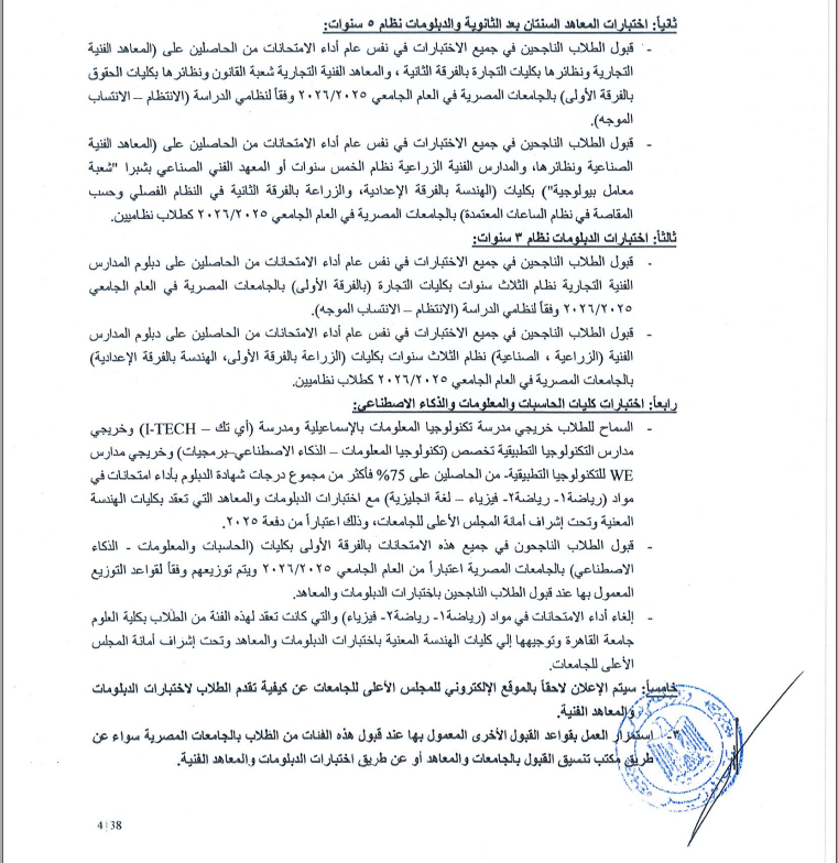 قبول الطلاب الناجحين في جميع الاختبارات في نفس عام أداء الامتحانات من الحاصلين على المعاهد الفنية الصناعية،ونظائرها، والمدارس الفنية الزراعية نظام الخمس سنوات أو المعهد الفني الصناعي بشبرا "شعبة معامل بيولوجية") بكليات الهندسة بالفرقة الإعدادية والزراعة بالفرقة الثانية في النظام الفصلي وحسب المقاصة في نظام الساعات المعتمدة بالجامعات المصرية في العام الجامعي ٢٠٢٦/۲۰۲٥ كطلاب نظاميين.