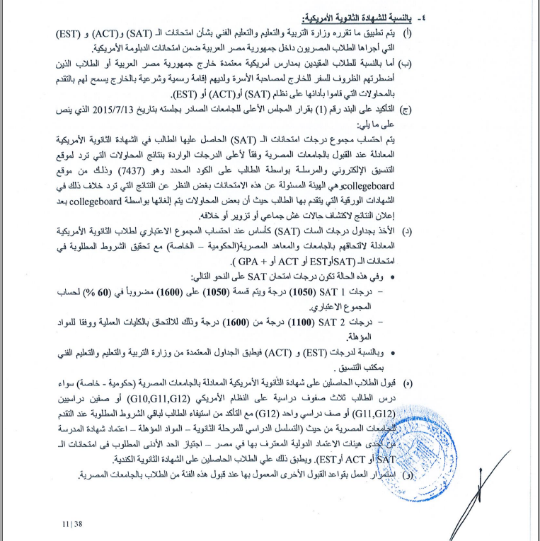(ب) أما بالنسبة للطلاب المقيدين بمدارس أمريكية معتمدة خارج جمهورية مصر العربية أو الطلاب الذين أضطرتهم الظروف للسفر للخارج لمصاحبة الأسرة ولديهم إقامة رسمية وشرعية بالخارج يسمح لهم بالتقدم بالمحاولات التي قاموا بأدائها على نظام (SAT) أو (ACT) أو (EST).