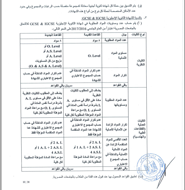 ( أ) يتم حساب عدد ومستويات المواد المطلوبة في شهادة الثانوية الإنجليزية GCSE & IGCSE للالتحاق بالجامعات المصرية اعتبارًا من العام الجامعي 2017/2016 على النحو التالي: