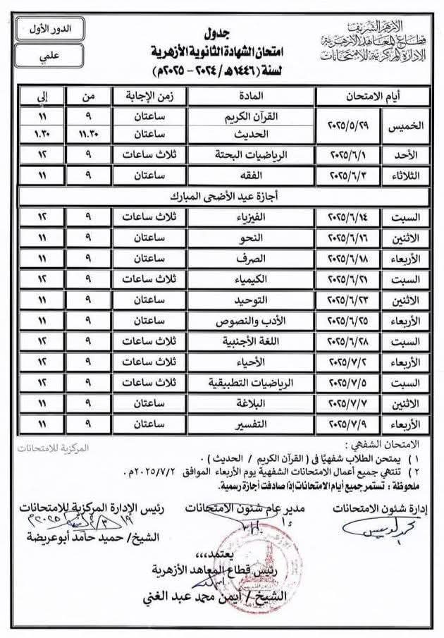 - جدول امتحانات الثانوية الأزهرية 2025 علمي