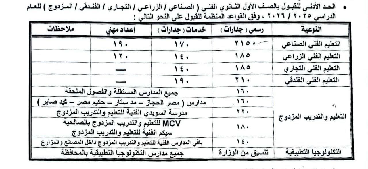 كما حدد تنسيق القبول بالمرحلة الثانوية للتعليم الفني للعام الدراسي 2025 /2026 م، وتقرر أن يكون الحد الأدنى لكل نوعية من نوعيات التعليم الفني (صناعي – زراعي – تجاري - فندقي) ومدارس التعليم والتدريب المزدوج طبقا للكشوف المرفقة بداية من 215 درجة الدبلوم الفني الصناعي، 210 درجة فندقي، 185 درجة الزراعي، 160 درجة تعليم المزدوج.